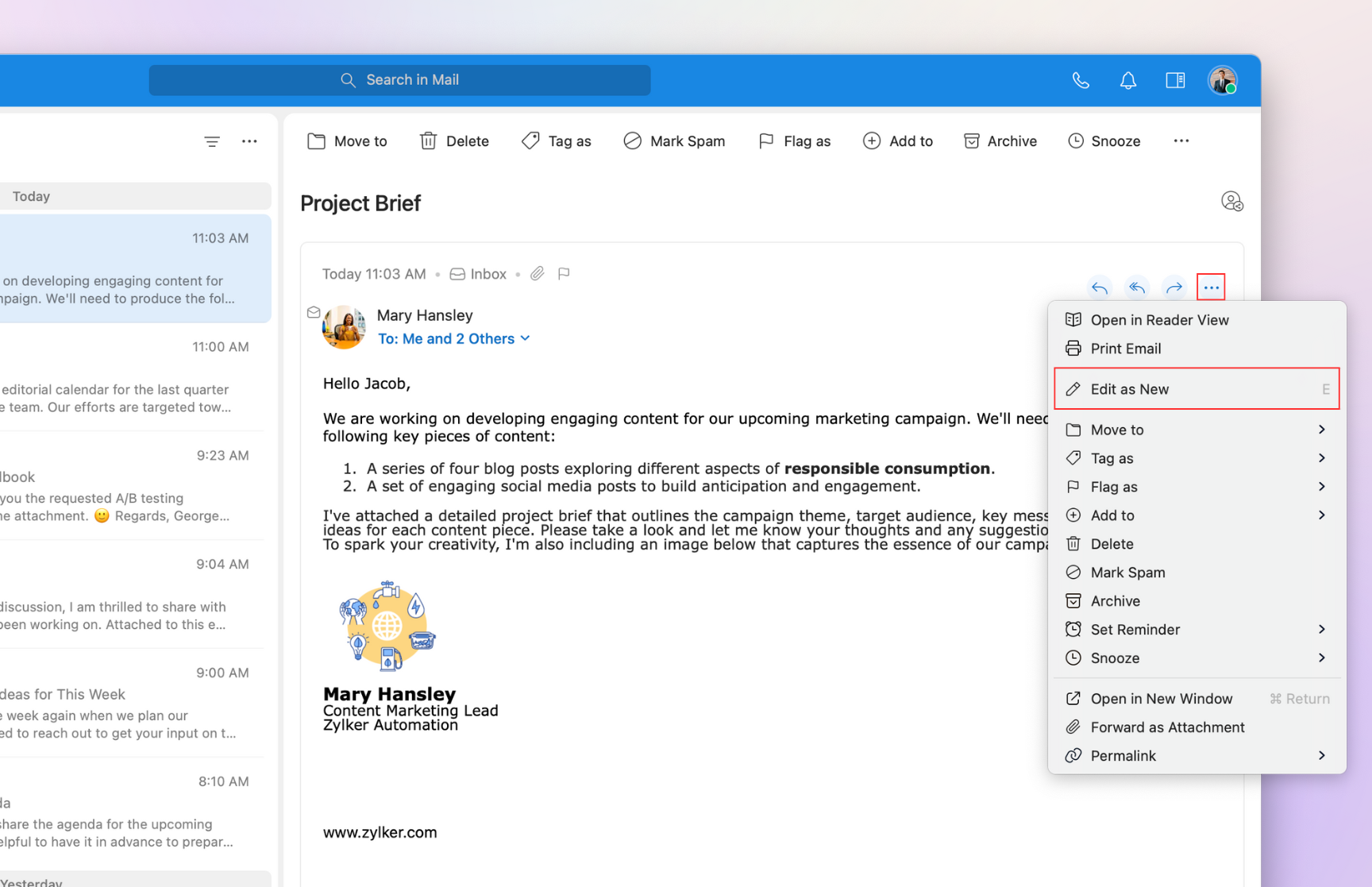 You can make changes to an email you've received or that has already been sent, by using the Edit as New option. Clicking on this option will open the email in the Mail Composer window, allowing you to make necessary changes to the email content.