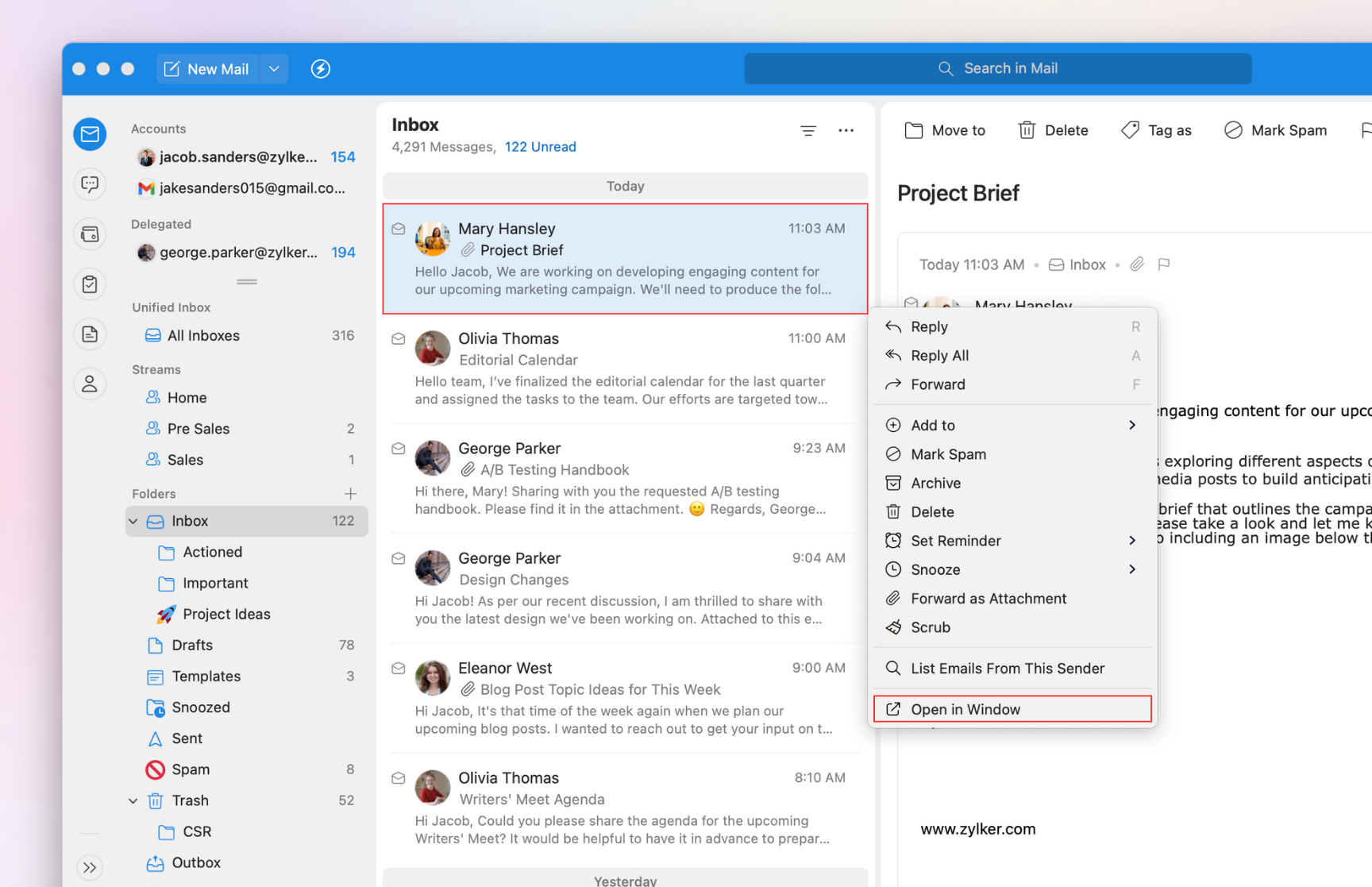 You can view the emails you've received in the detail view at the left with a vertical split, at the bottom with a horizontal split, or without a split, depending on how you've customized it.