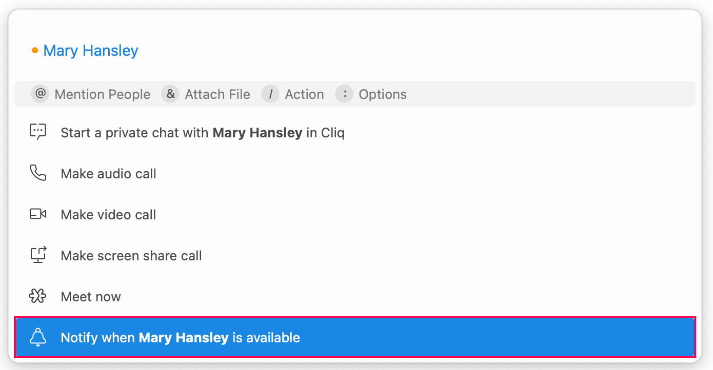 With Smart Assistant for Cliq, you can place audio, video, or screen-share calls, start a one-on-one or group chat, and manage your Cliq status.