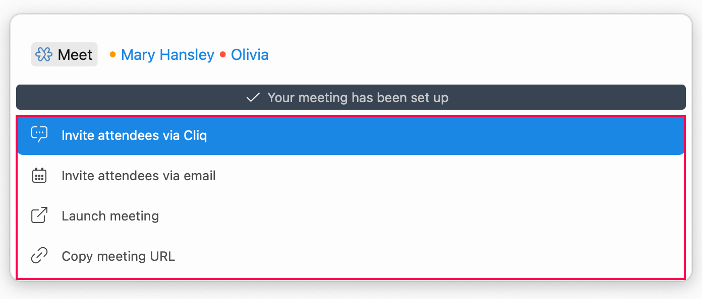 You and the participants will receive the meeting link in an email and via Zoho Meeting Bot in Cliq if you've subscribed to it.