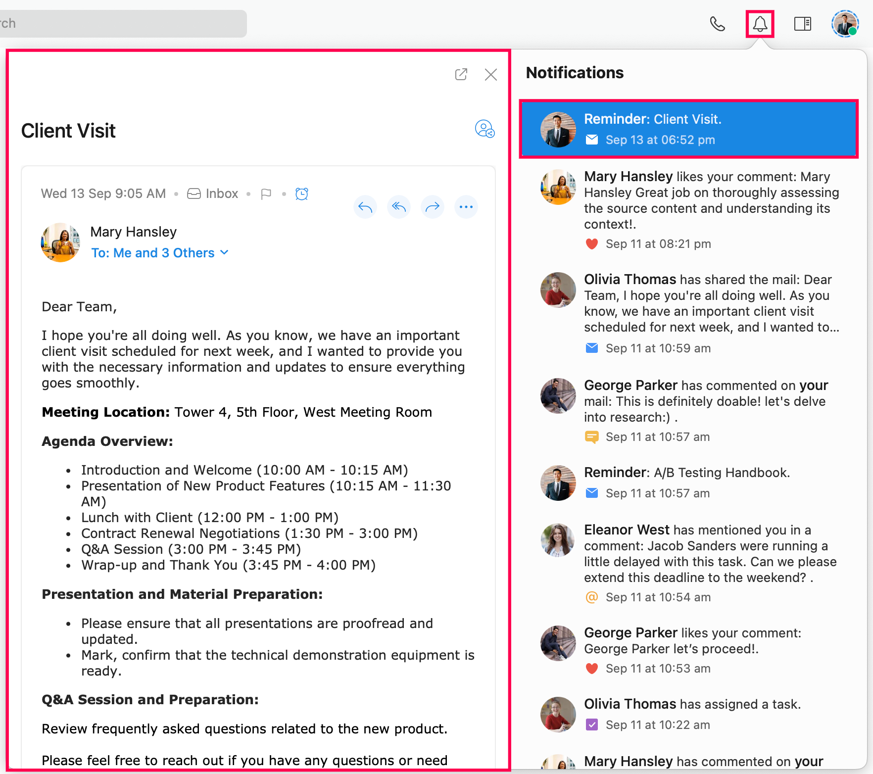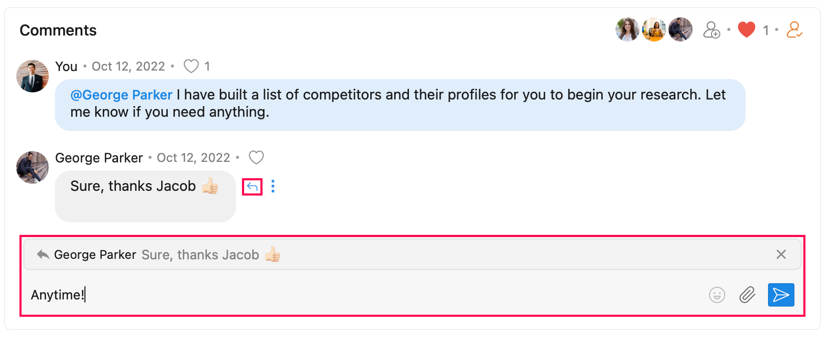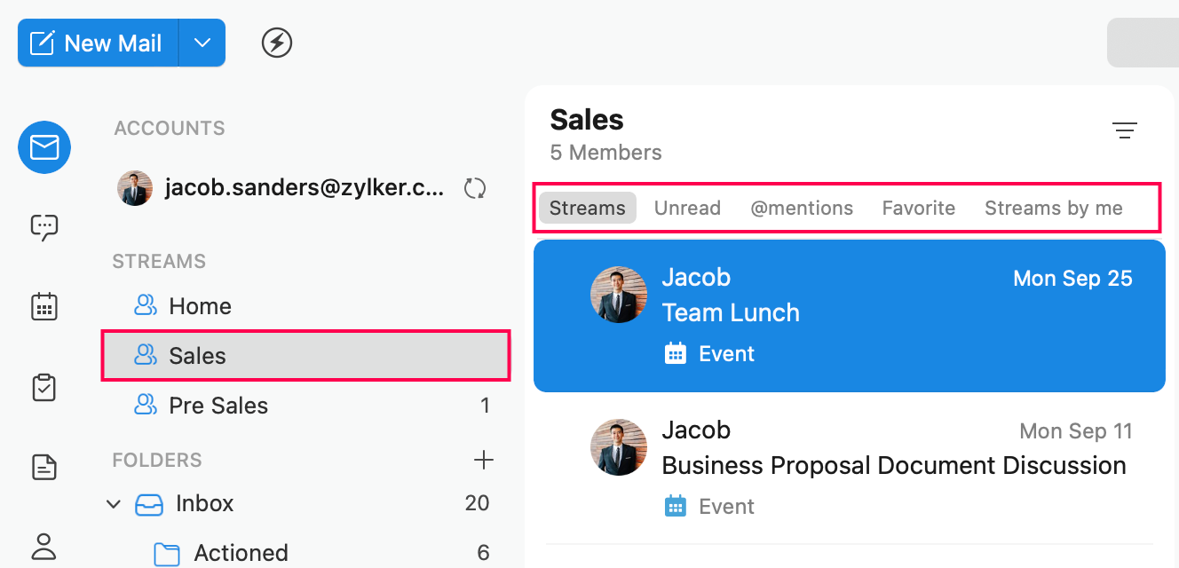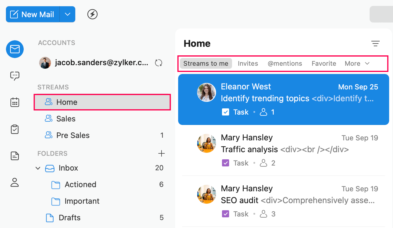 Streams enable communication and collaboration with individuals or a group of people in the social media style. You can share emails, notes, and tasks with other users or groups via Streams, and they can like the content you've shared, comment, reply to comments, add invitees, react with emojis, and share files.