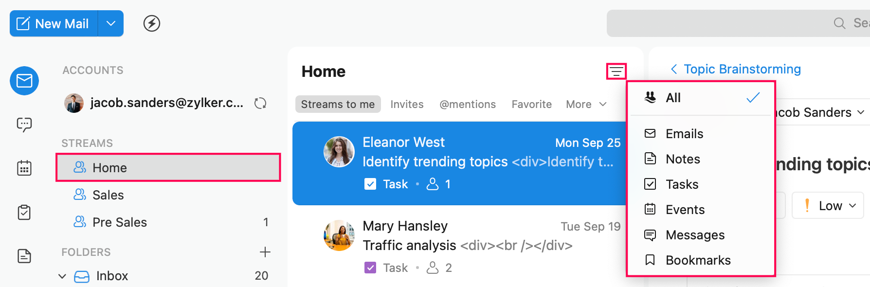 To filter the Streams post and list it by whether its an email, note, task, event, message, or bookmark: