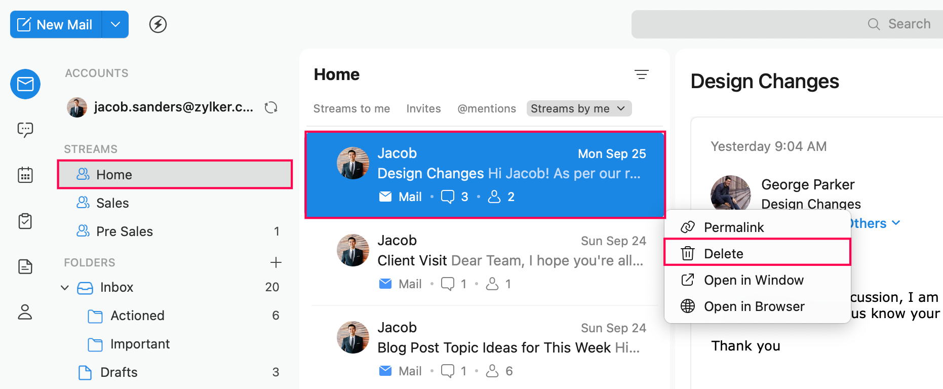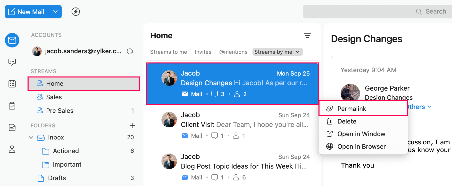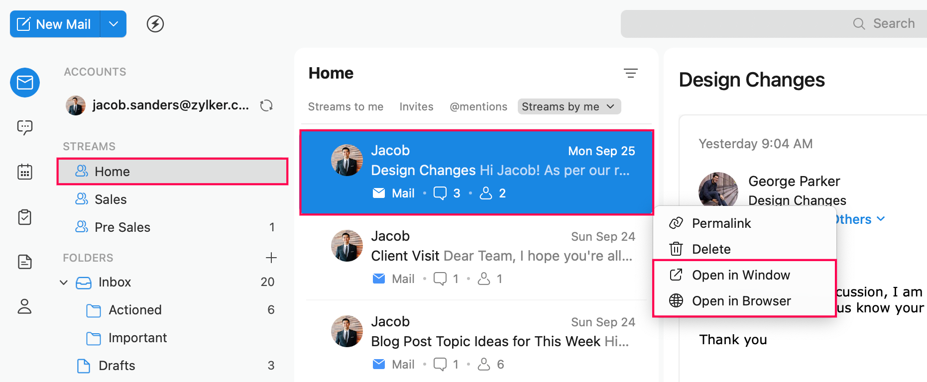 Besides the standard inline view, you can choose to view a Streams post in a new app window or in Zoho Mail web.
