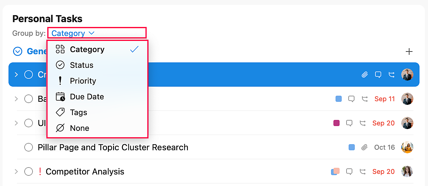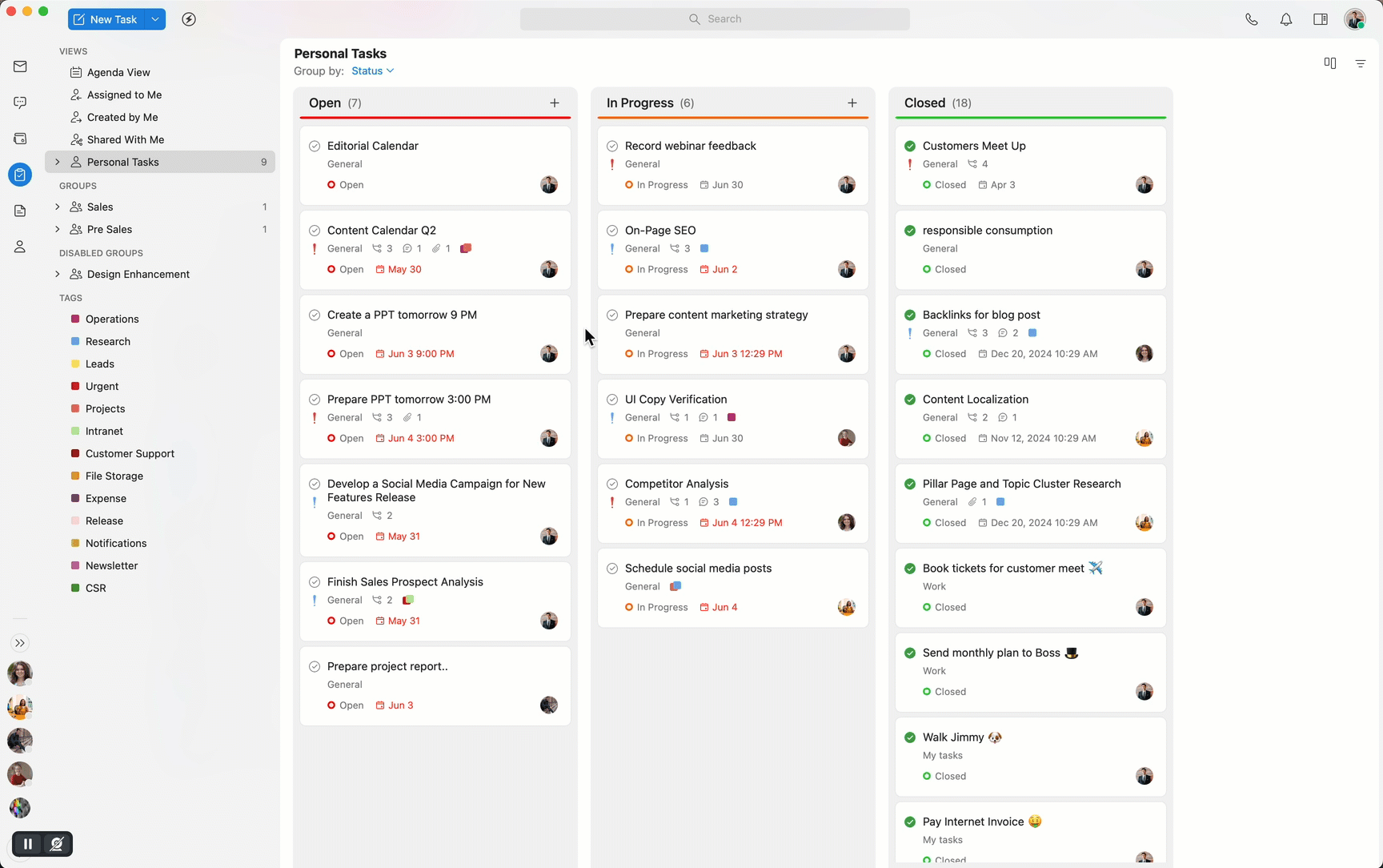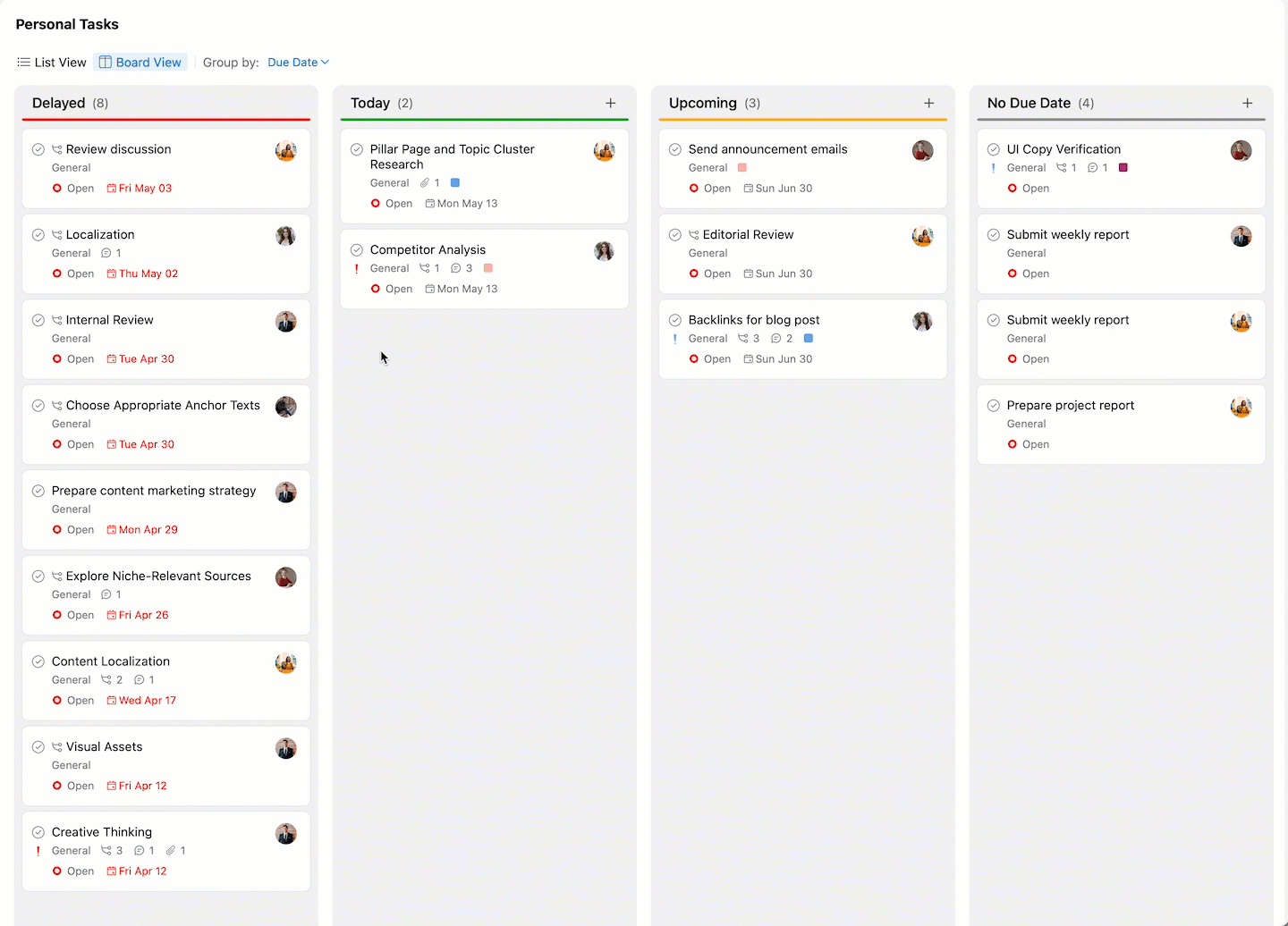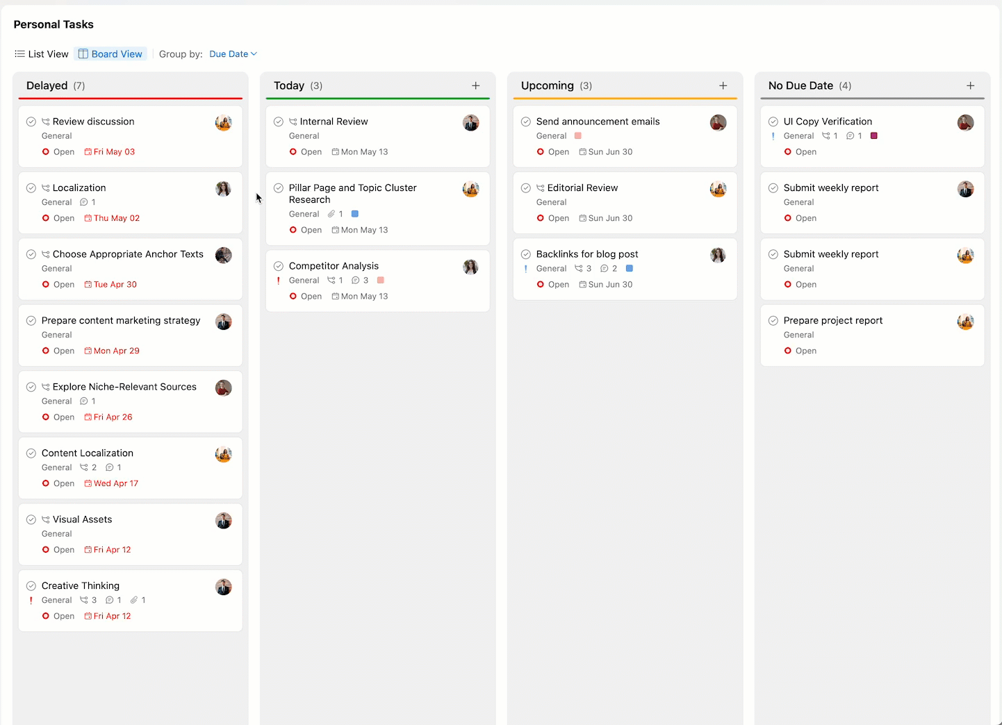 In the Board view, you can drag and drop tasks to easily update the category, status, priority, due dates, tags, and assignees.