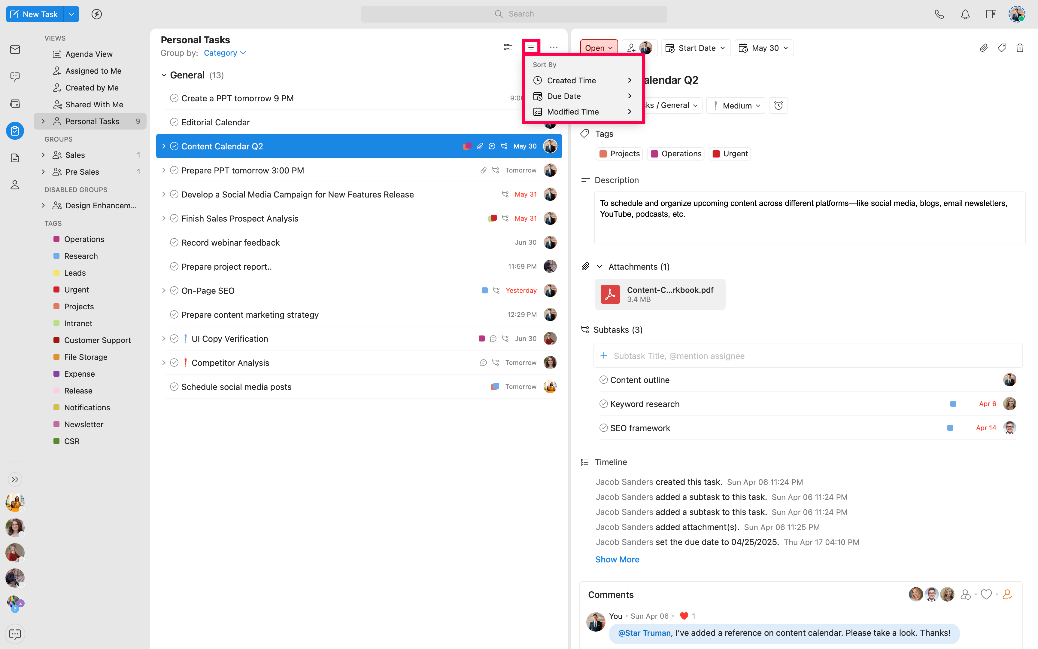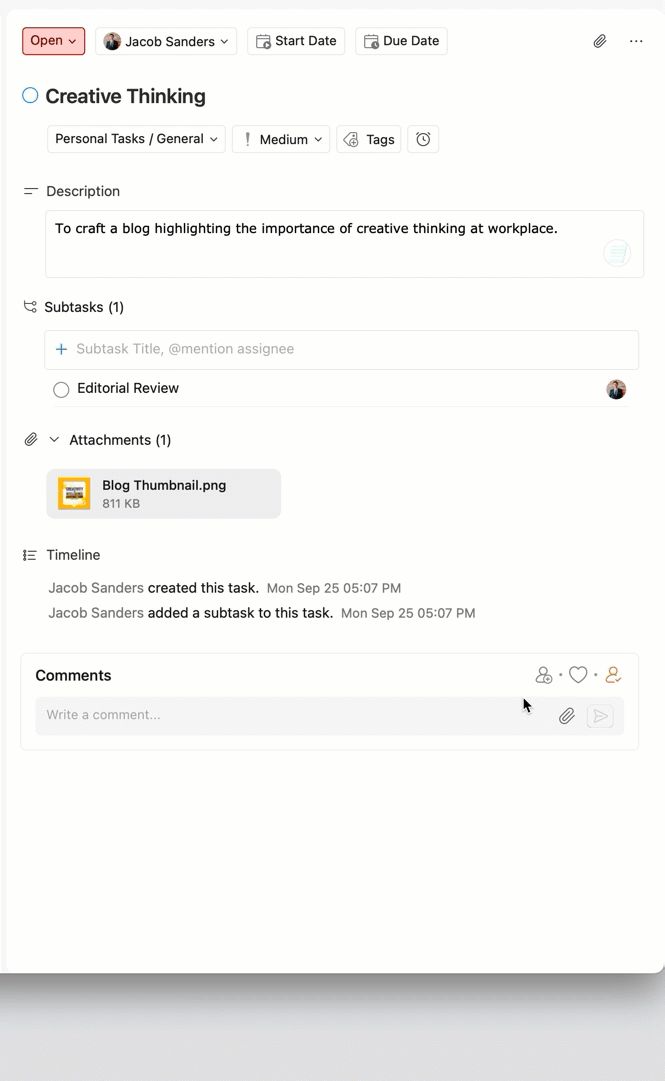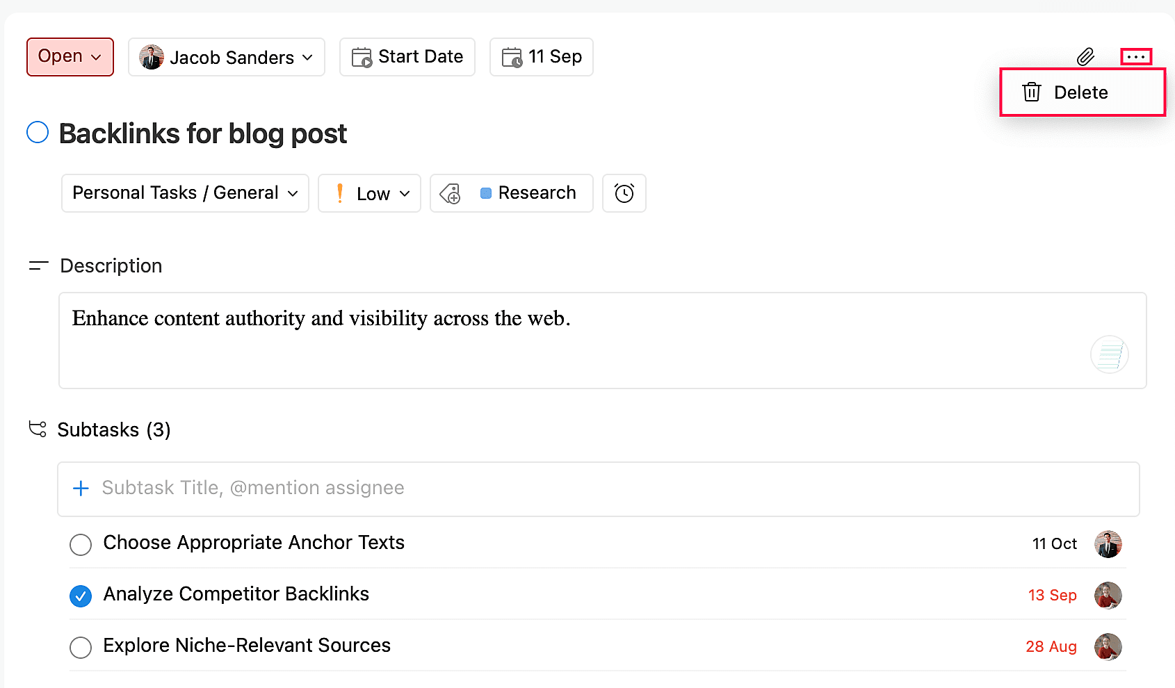 After you have created a task, you can edit the title, description, priority, due dates, and change or remove assignees whenever you need. To edit a task: