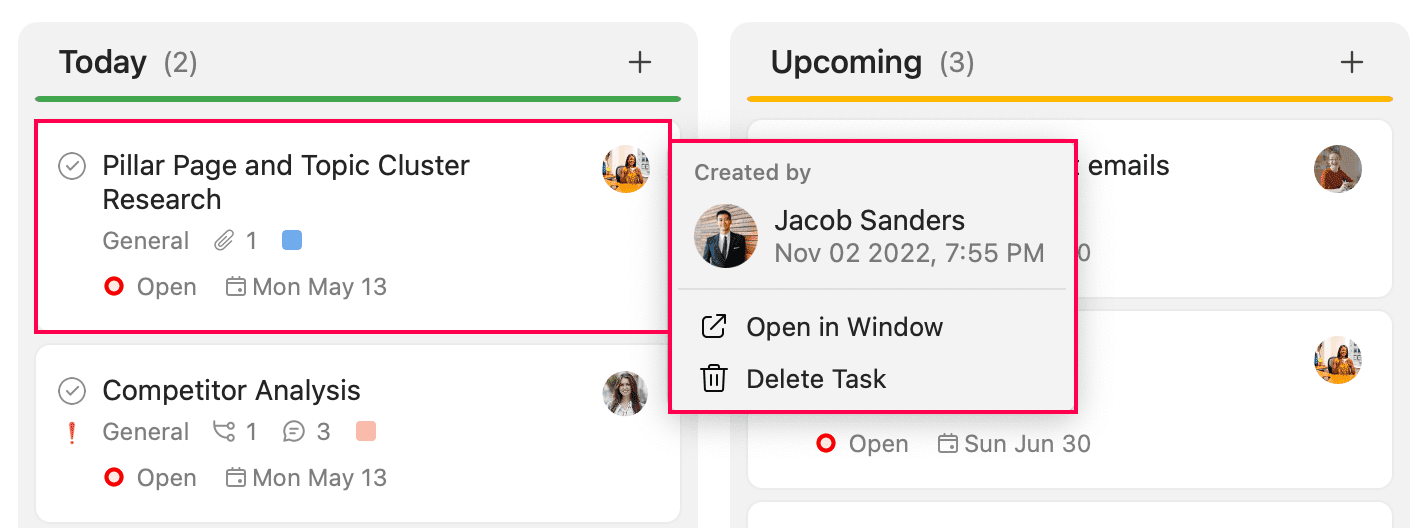 On right-clicking a task, you'll be able to see the task creator and date of creation, as well as options to open the task in a window or delete it.