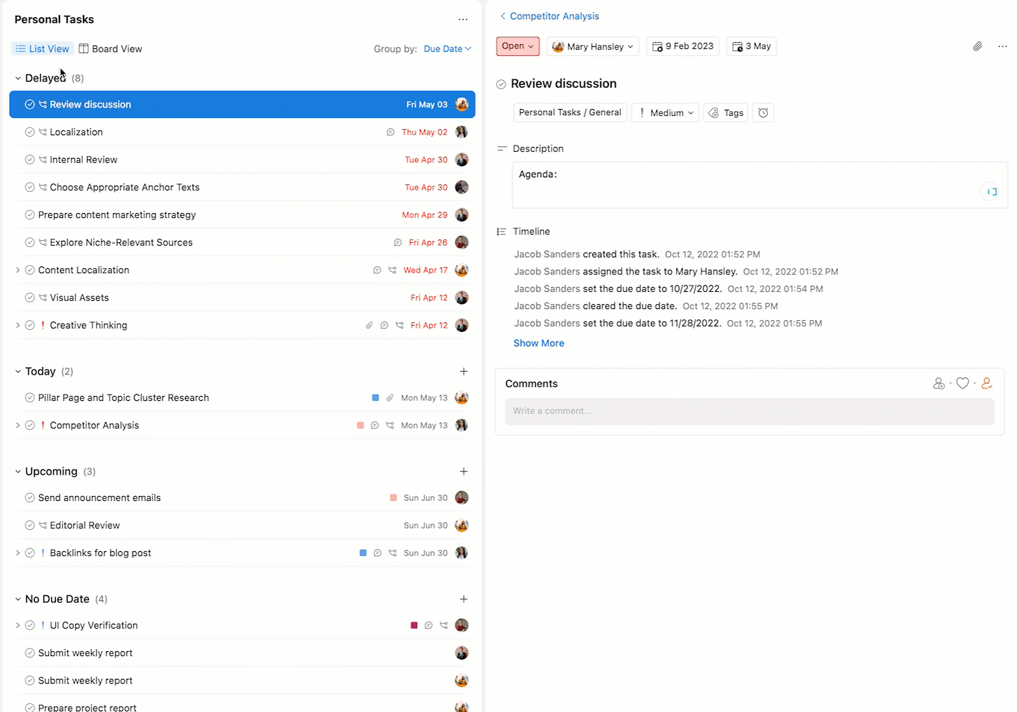 You can choose between the List and Board views to get a glimpse of all your tasks grouped by due dates or task assignees.