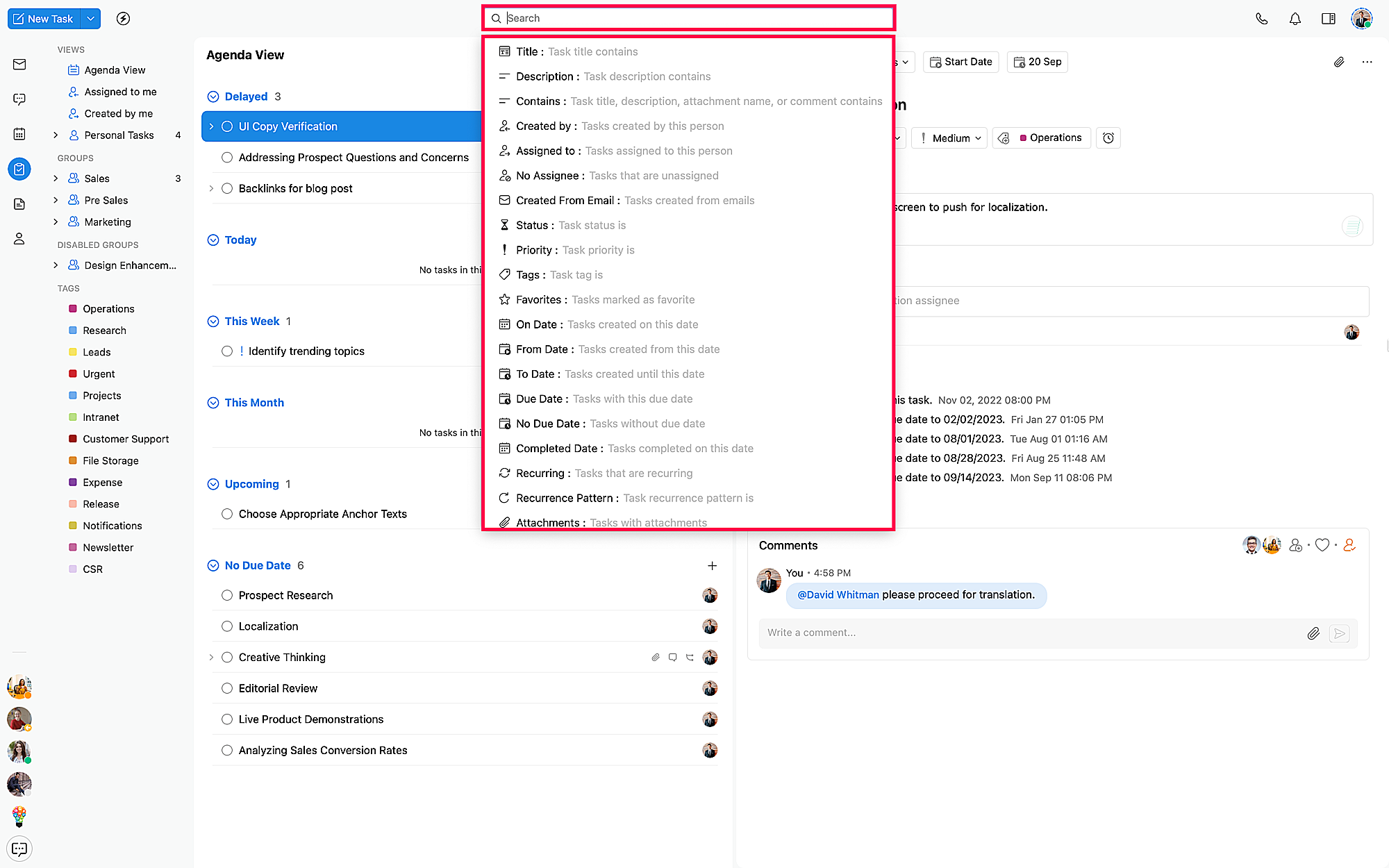 In this article, we'll see how you can search for tasks based on various criteria including title, content, creator, assignee, status, priority, and group.
