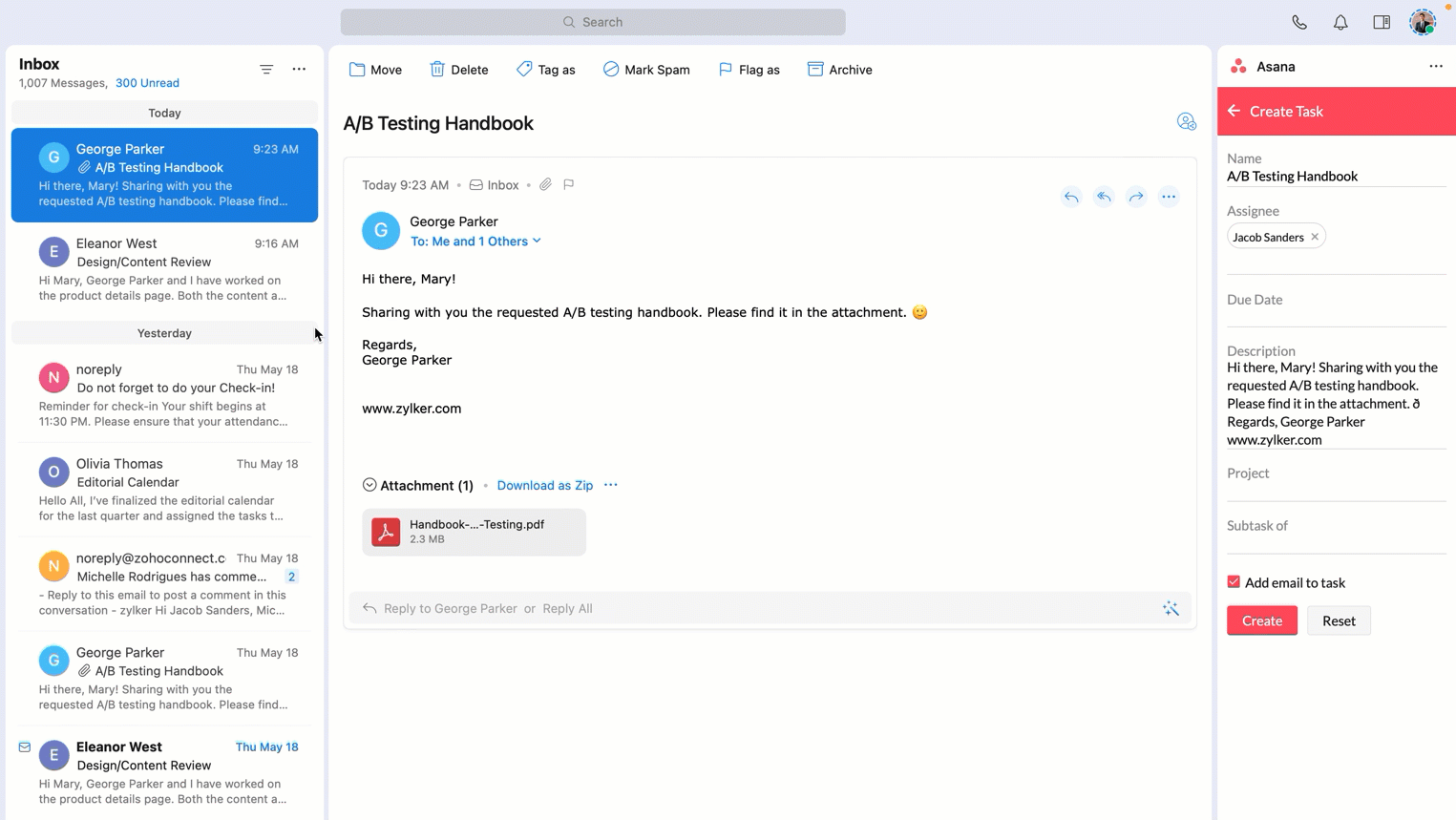 - Checking the Add Email to Task option will associate the newly created task with the email. When you visit the email again it will load the associated task details in the Asana widget.
