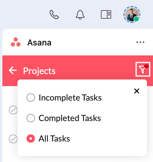 icon to choose between Completed Tasks, Incomplete Tasks, and All Tasks that you want to be displayed in the tasks list.