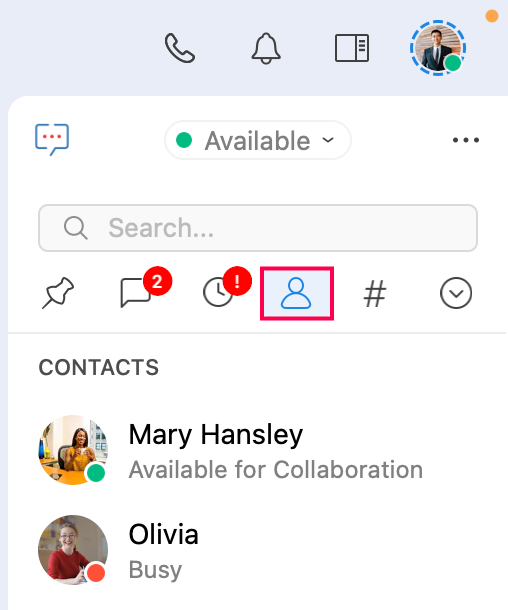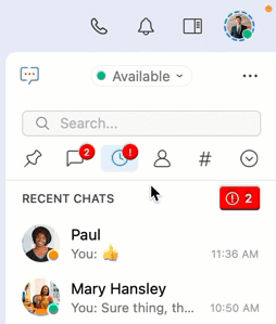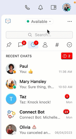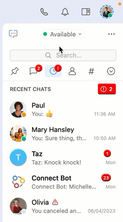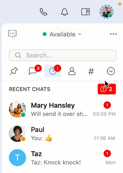 The search bar enables you to find chats, contacts, channels, threads, and messages. You can apply these filters while searching to narrow down the search results.