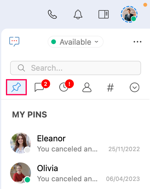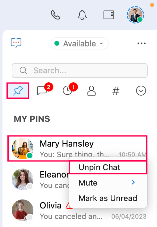 - Go to the Pinned Chats tab or search for the chat you want to unpin.