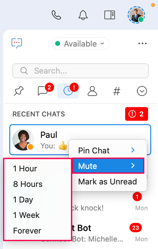 icon in the chat launcher tab. - Select Muted from the drop-down menu to list the muted chats. Alternatively, search for the chat you want to unmute and right-click it.
