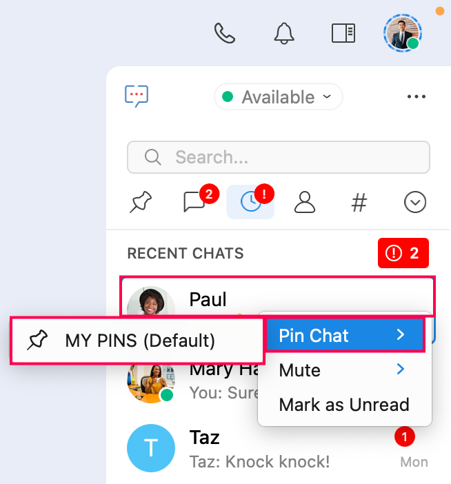 From the chat list, you can pin, mute, and mark chats as read or unread using right-click actions.