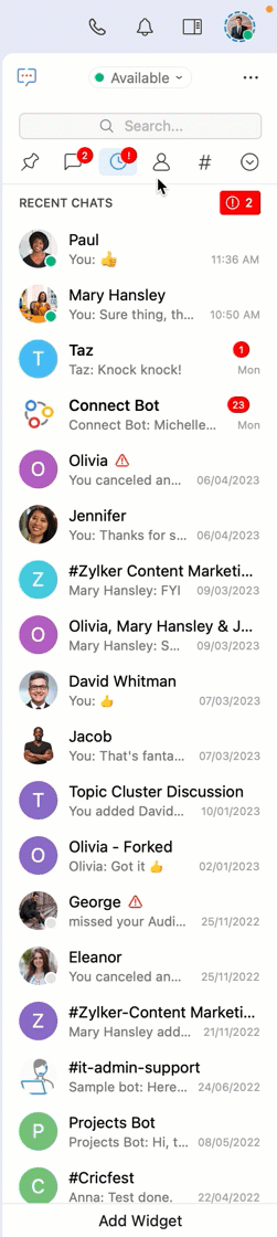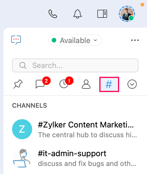 | | Lists the threaded conversations as separate chats from various channels. Note: This view is available only when the Cliq preference is set to In a Separate Threads Tab. |