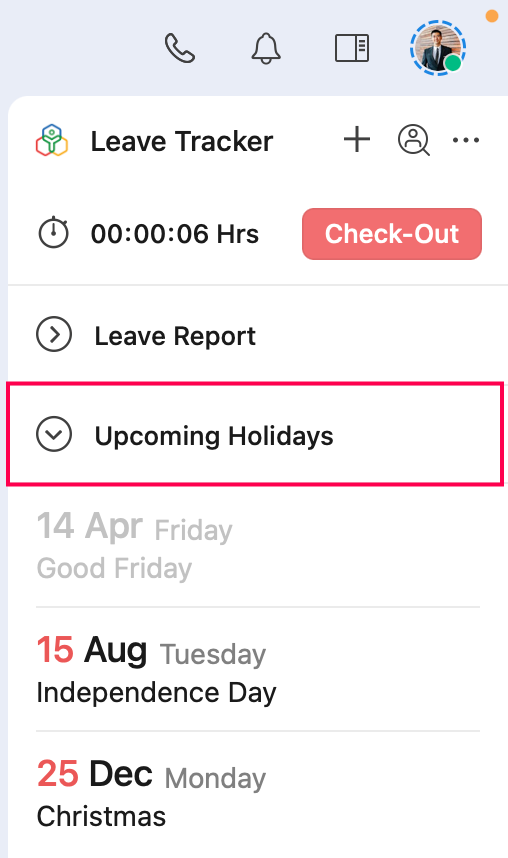 To view the available holidays and optional leave, click open the Upcoming Holidays drop-down menu.