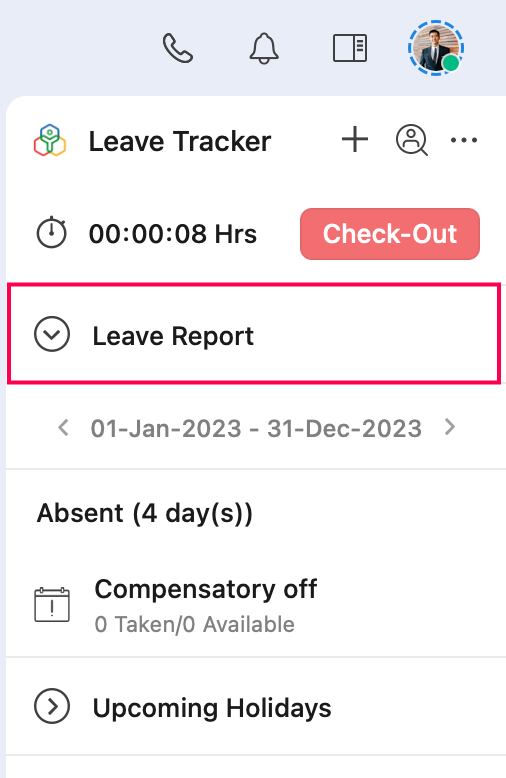 The Leave Report gives you an overview of the days you were absent and your available leave. To view them, click open the Leave Report drop-down menu. For that annual year, per your company's leave policy, you'll find the list of the types of leave, such as Casual Leave, Sick Leave, Optional Holiday, and others. This list will show you the amount of leave you've taken and the available leave under each leave type.