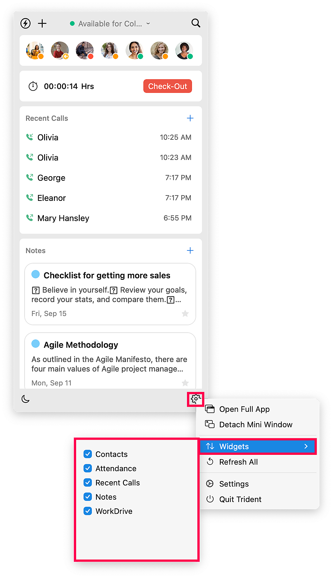 Trident's menu bar app supports the following widgets: