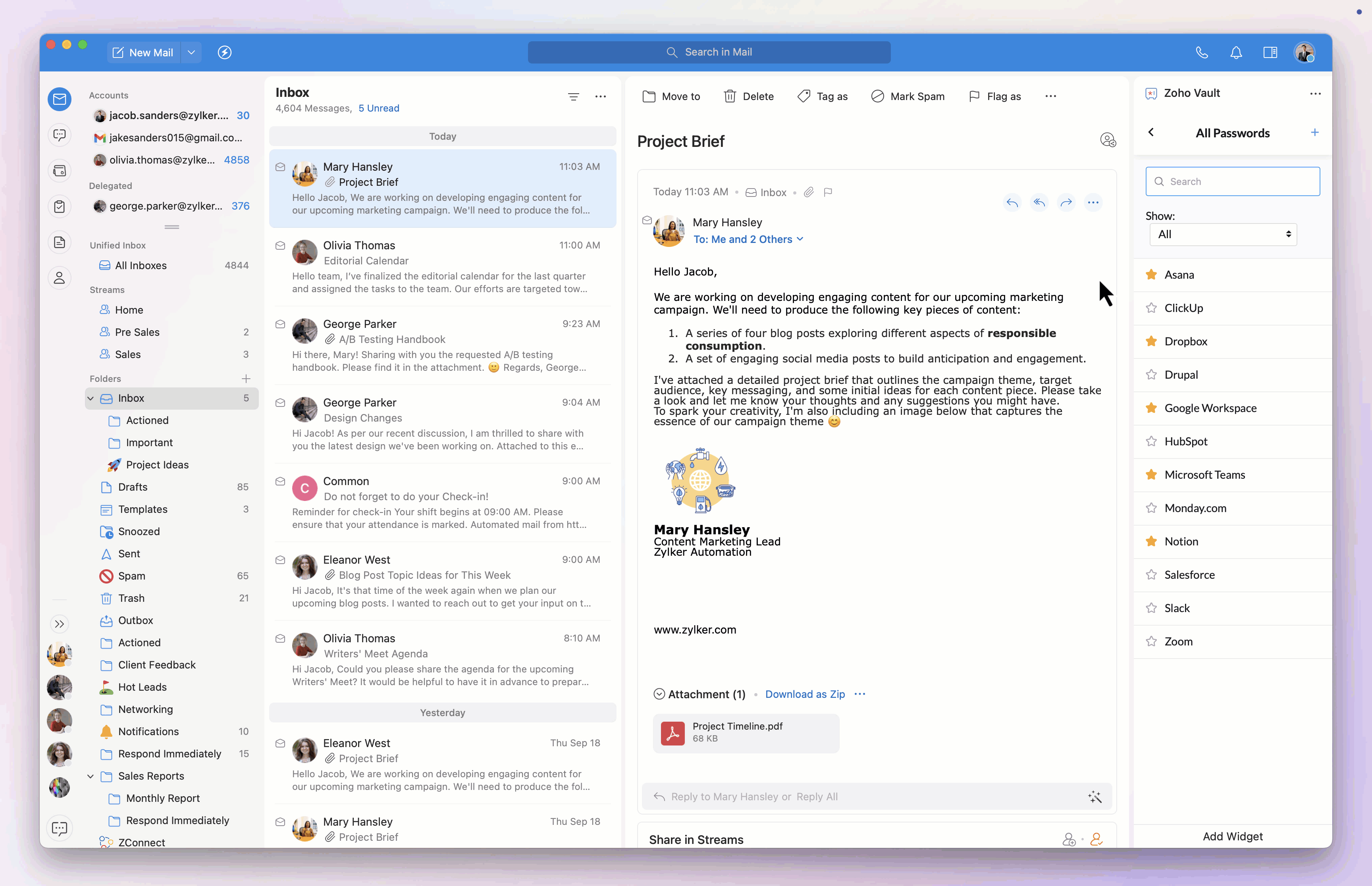 All passwords stored in Zoho Vault are listed under the All Passwords section. Clicking on a password will display details, such as username, password, URL, and notes.