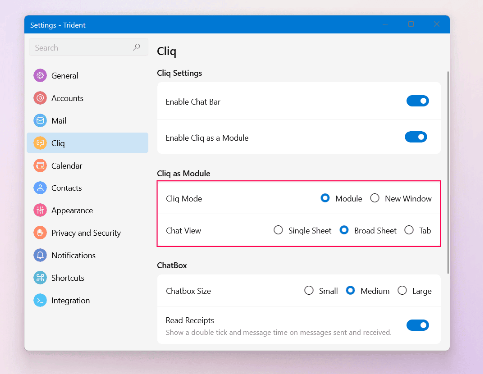 In the Cliq Settings section, you can choose to enable Cliq as a chat bar and a separate module.