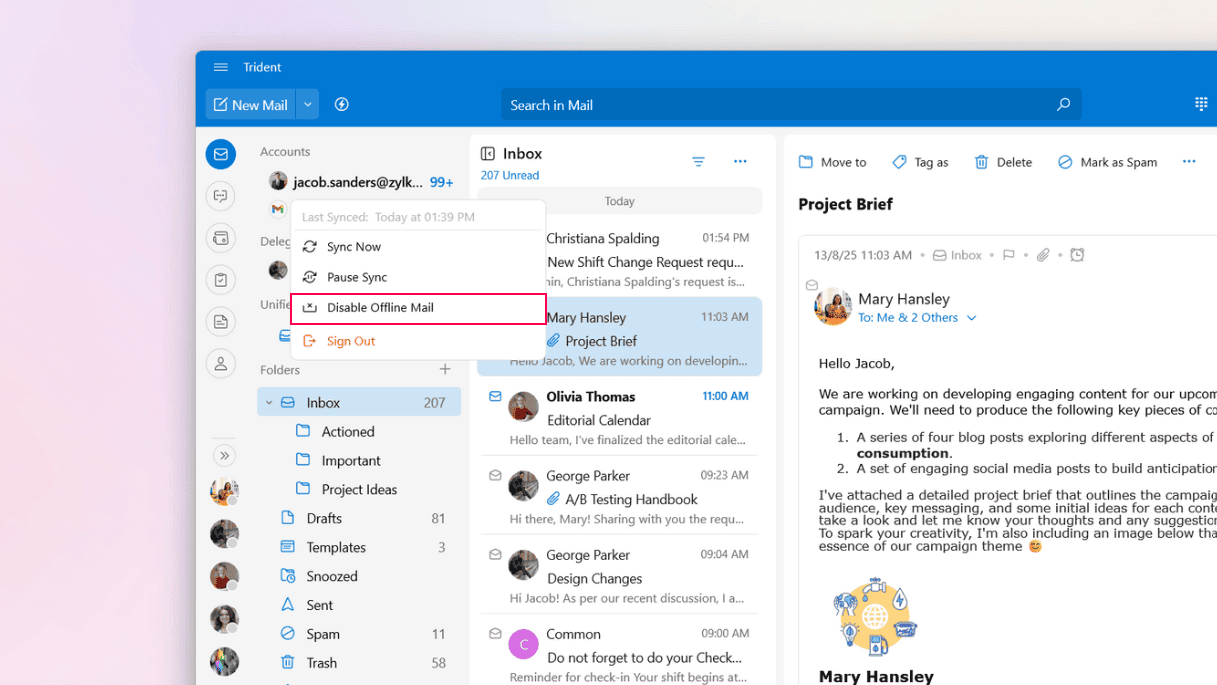 After disabling offline mail sync, Trident will stop downloading additional emails from our servers thereafter, and the overall app size will stabilize. To ensure system space is freed after disabling offline mail: