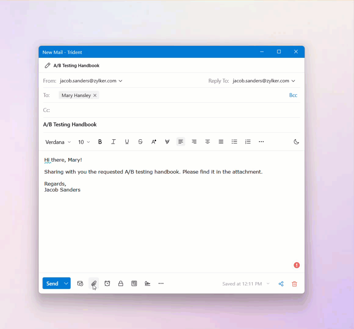 Click the Attachment icon in the Mail Composer and click Attach From WorkDrive.