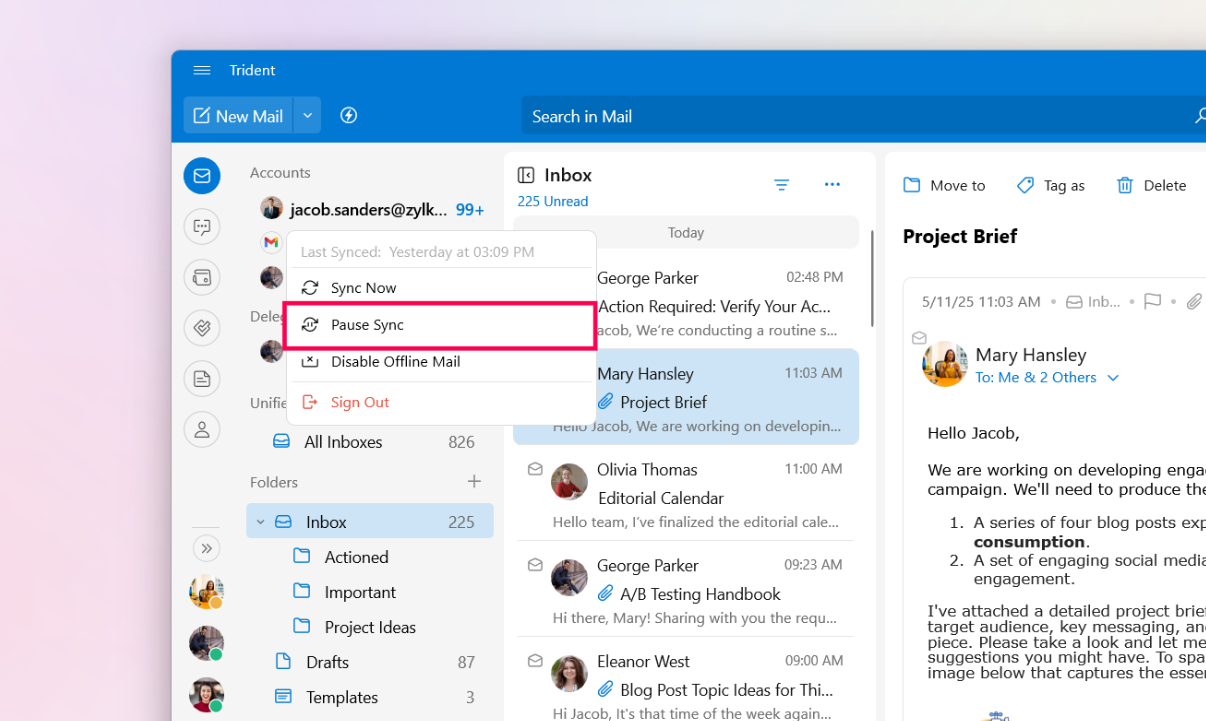 1. Right-click the email address in the Account switcher. Select Pause Sync from the menu list.