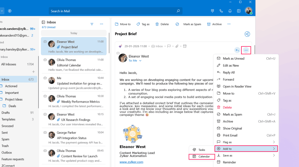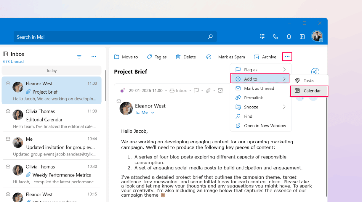 2. Select Add to > Calendar from the menu list.