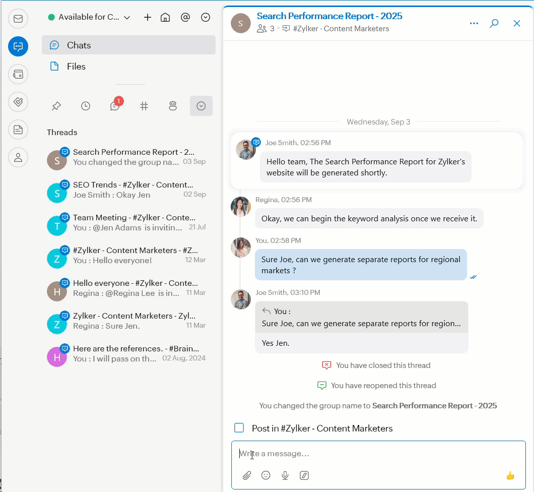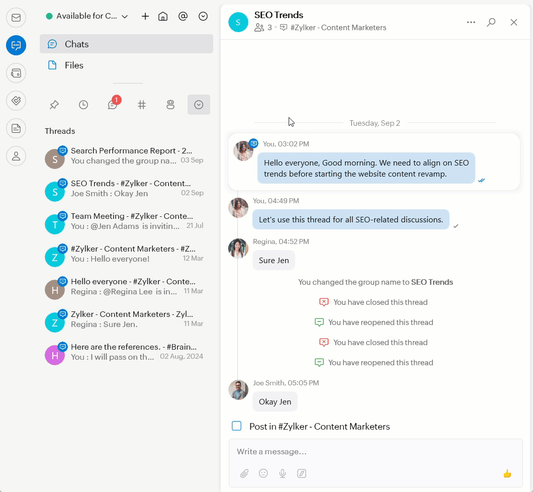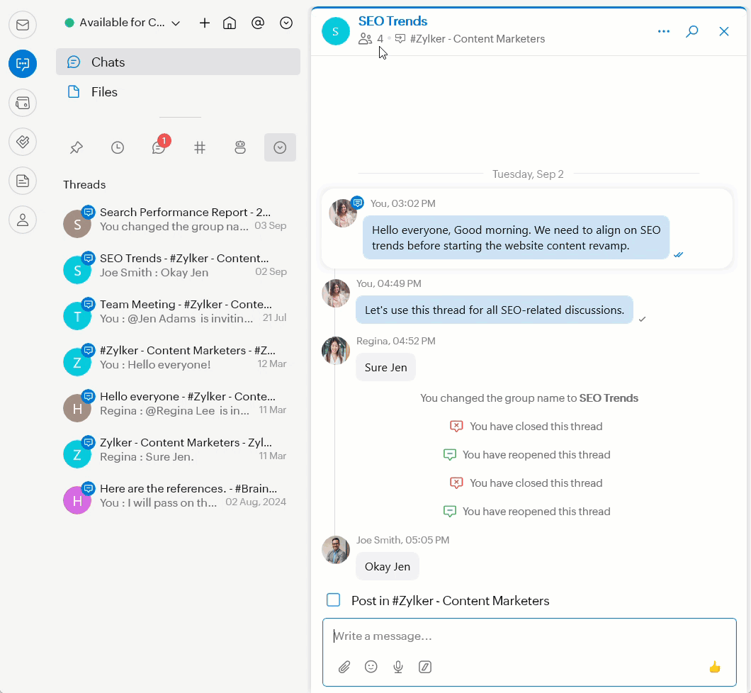 InfoNote: This article explores communicating via threads in channels in the Trident desktop app. Click here for the Zoho Cliq web app's help documentation.