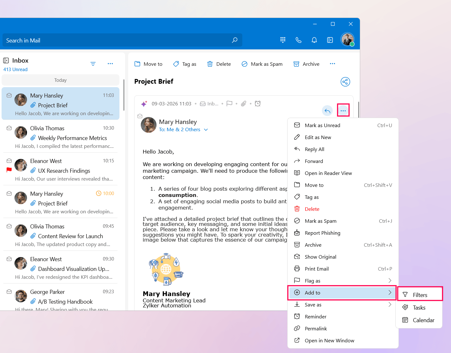 From: mary.hansley@zylker.com Priority: High | Move to: "Respond Immediately" folder |