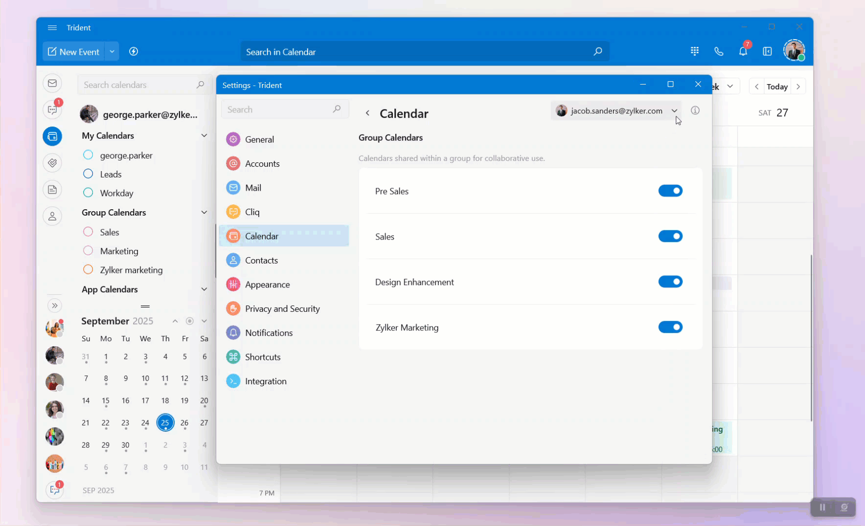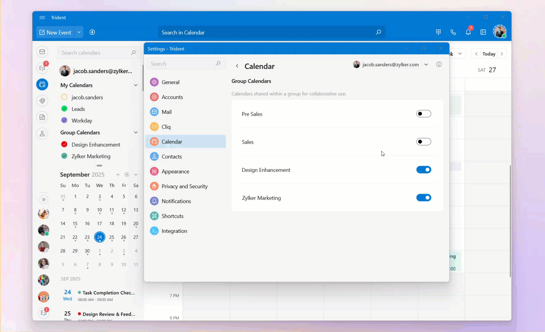 In the Settings window, you can also easily switch the user account to view or hide calendars specific to that account.