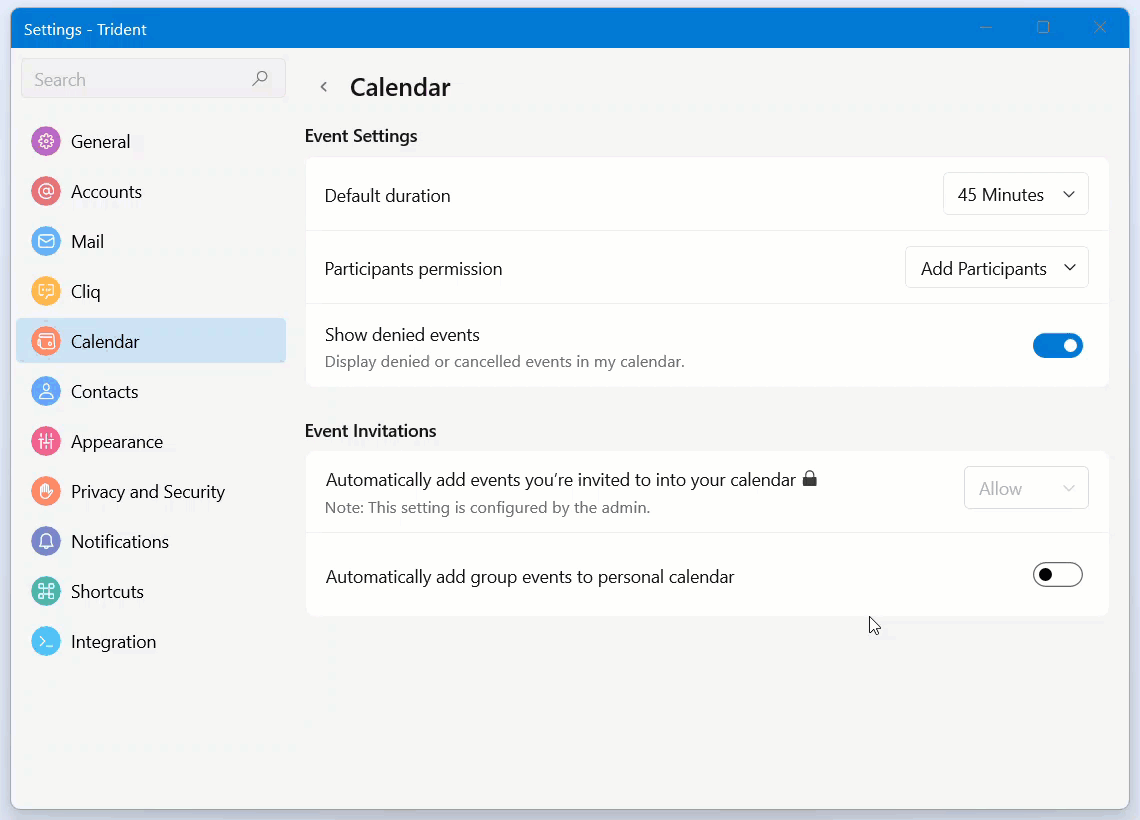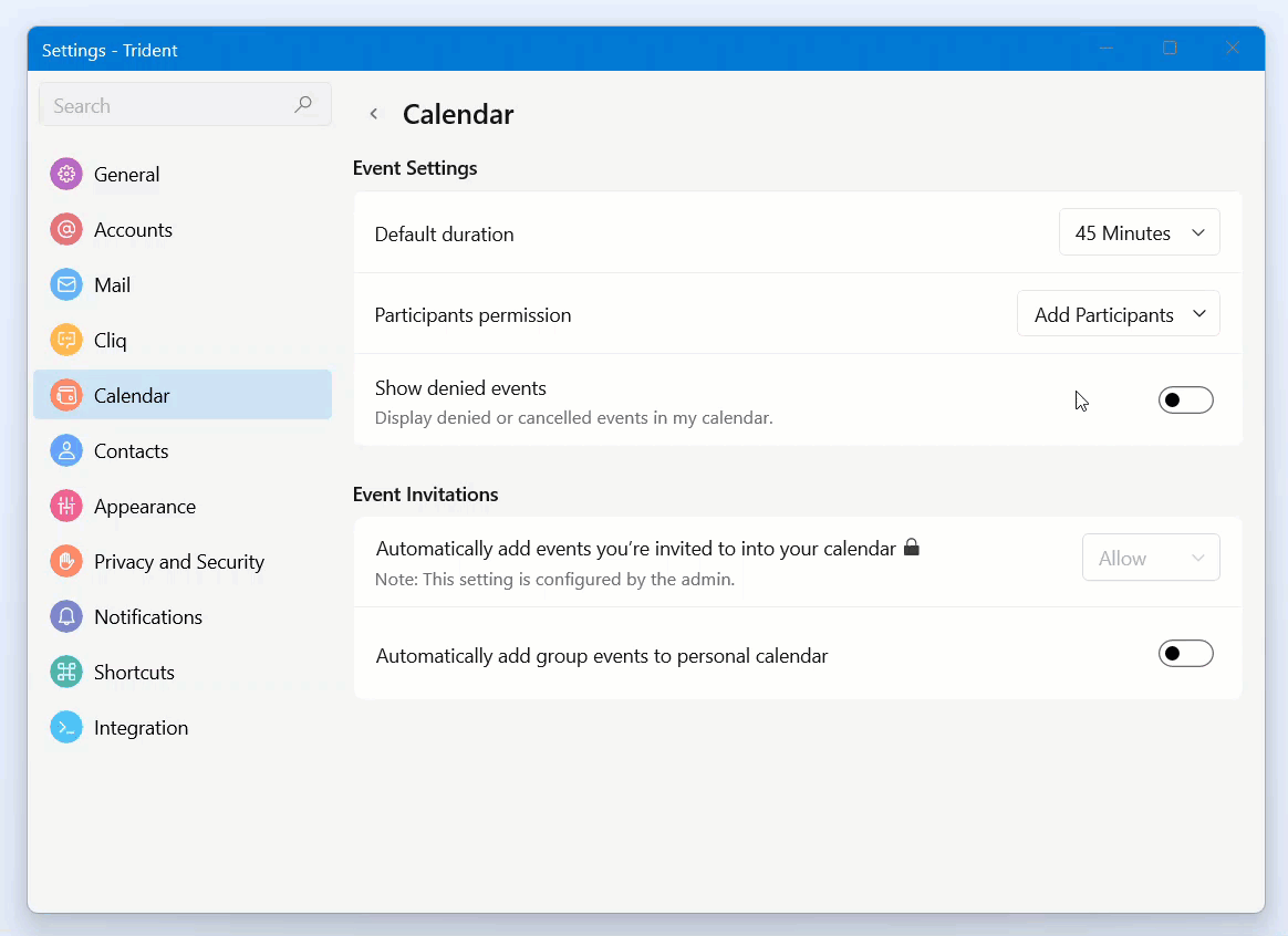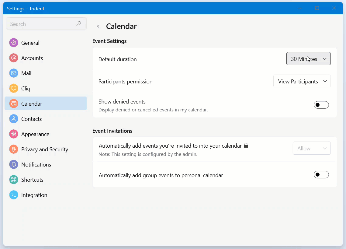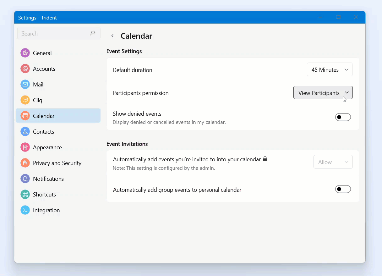 With Trident's event settings, you can set event duration participant permissions, manage event invitations, and more.