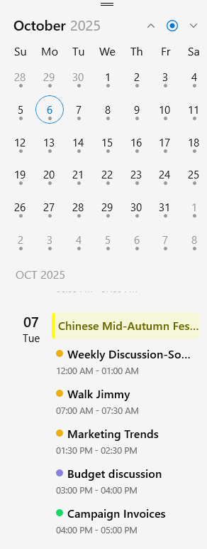 The Agenda View is a mini-calendar that lists all of the events that have been scheduled for each day.