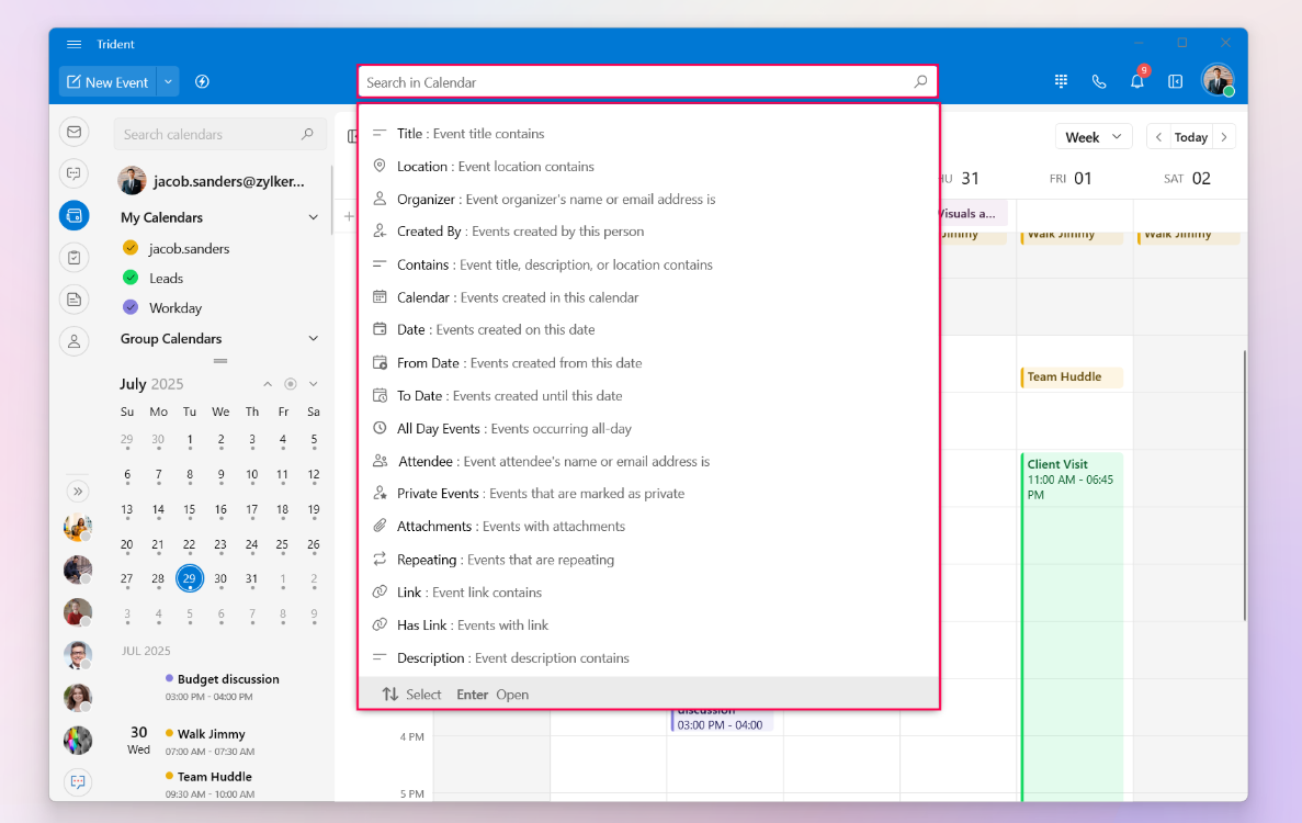 Search in Calendar offers more than 15 distinct search parameters. Each parameter and its function is described below.