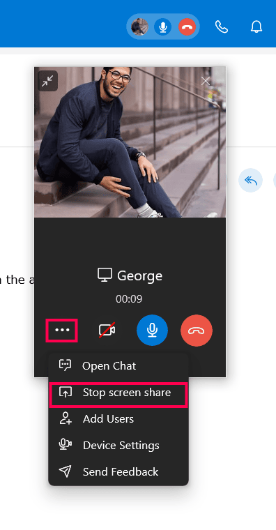 Alternatively you can also, click the Stop Screen Share icon from the call window.