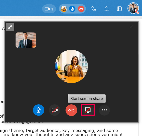 You can initiate a screen-share call only in one-on-one chats. You can, however, share your screen while on a one-on-one or group call.