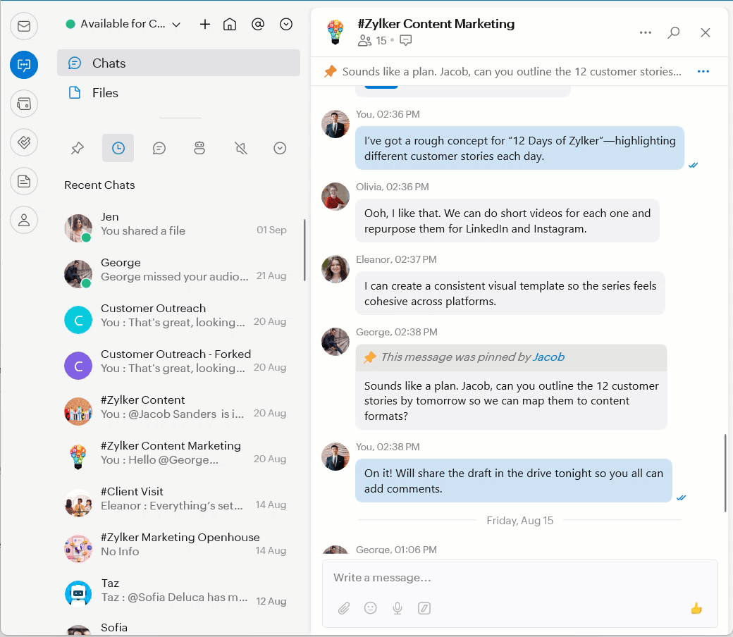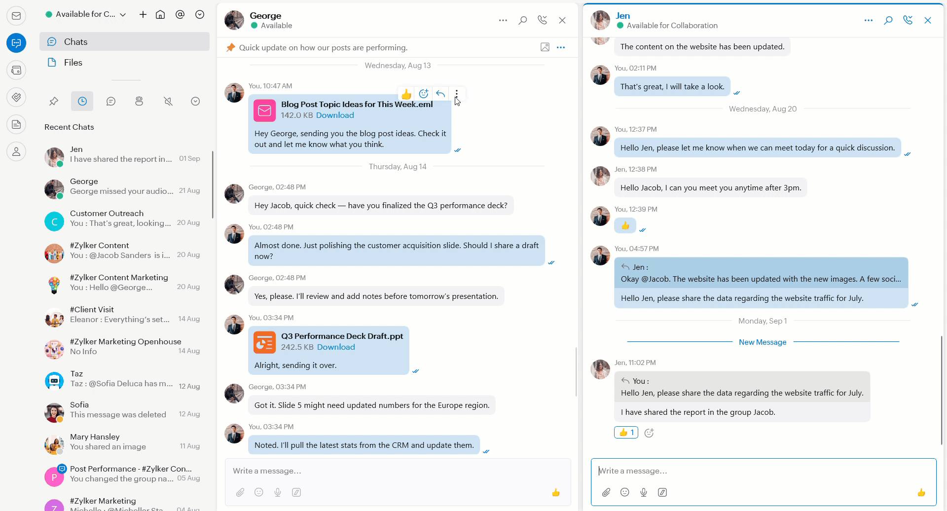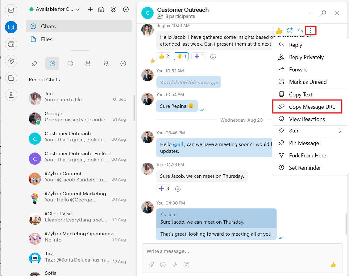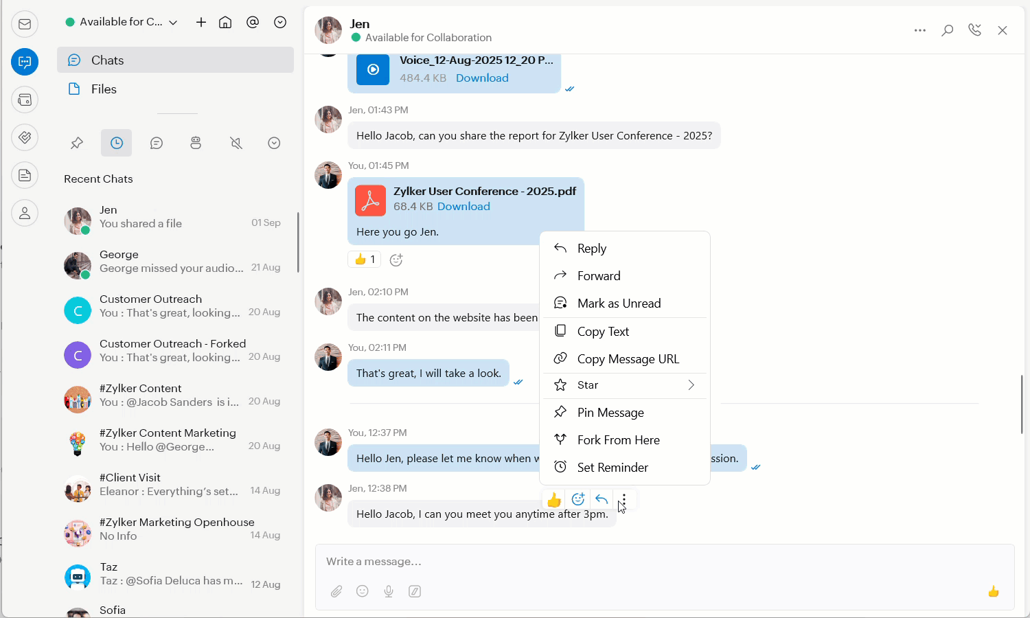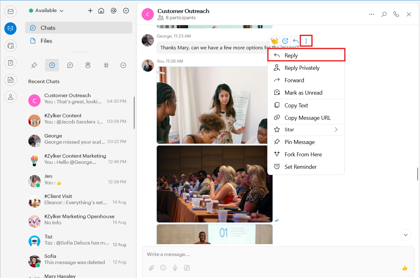You can reply privately to messages in Cliq channels, threaded conversations, and group chat. To do so: