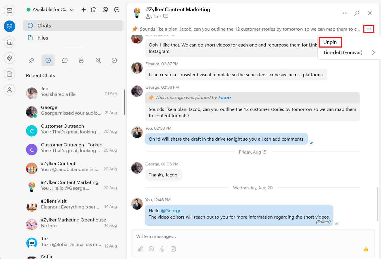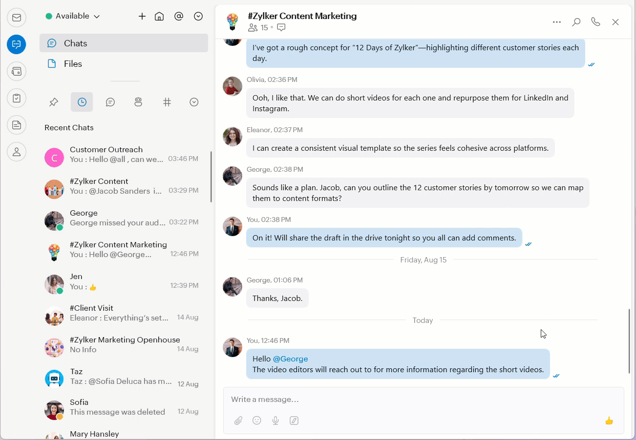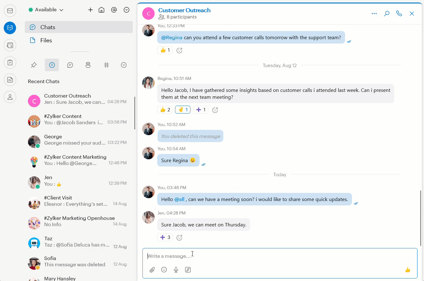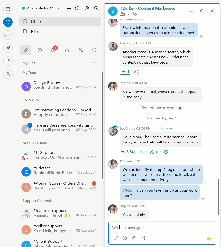 You can reply privately to messages in Cliq channels, threaded conversations, and group chat. To do so: