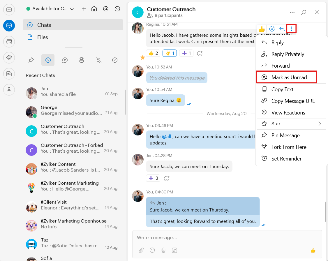You can also mark a message as unread by right-clicking the chat in the chat list and selecting Mark as Unread from the menu list. | ||