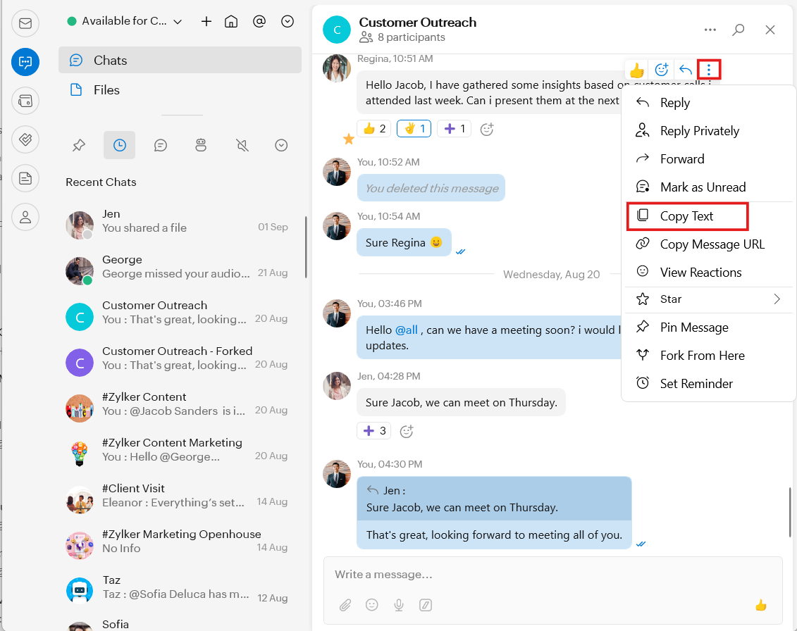 Copy Text | To copy chat contents to the clipboard. The copied content can be pasted in the chat box and other input fields or text editors using Ctrl + V. | |