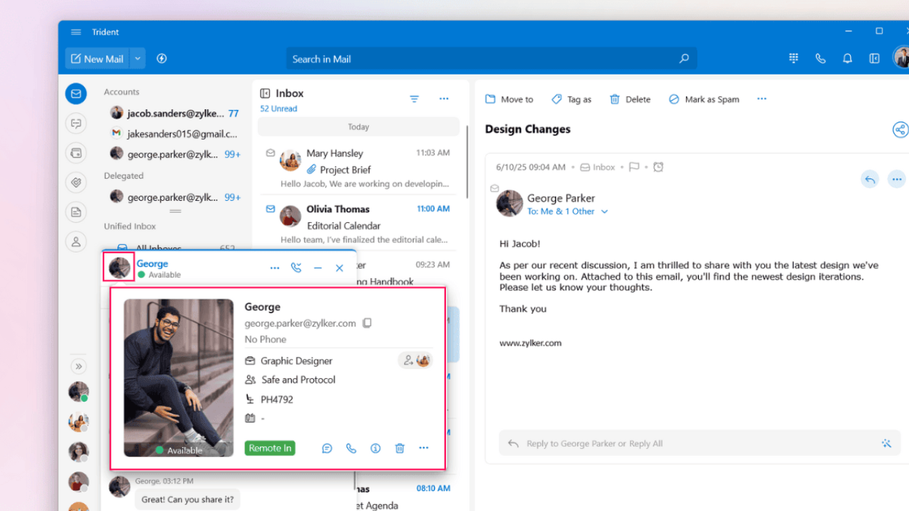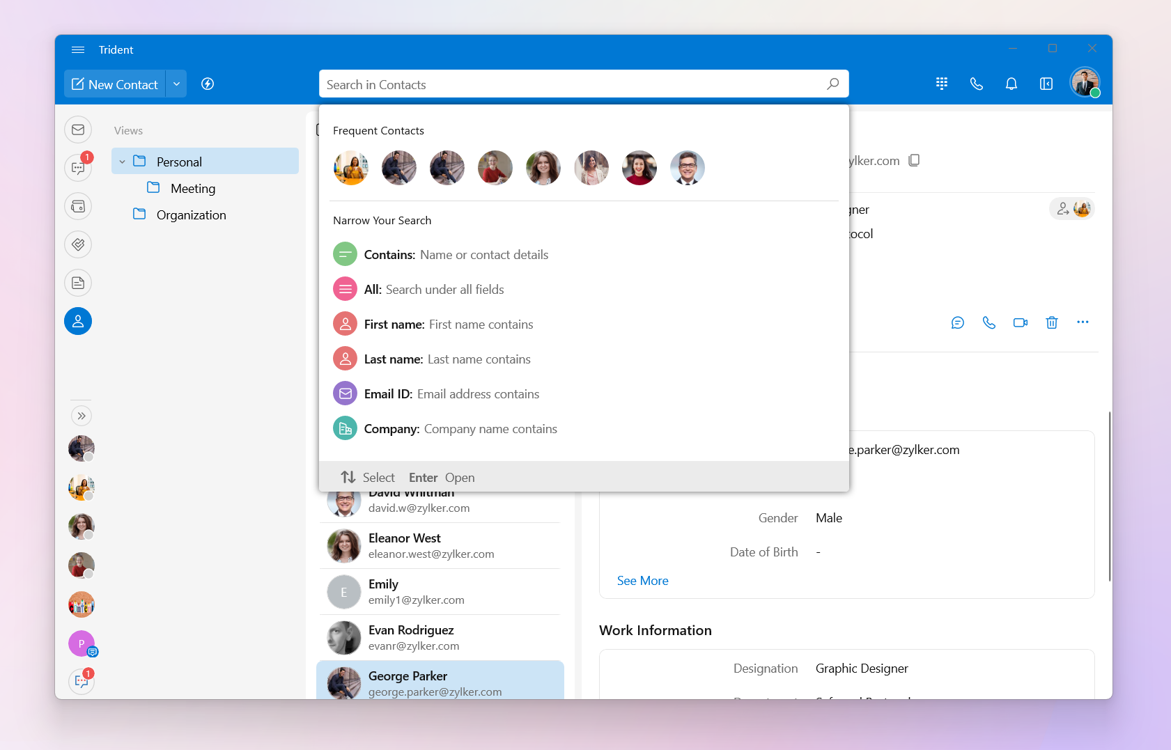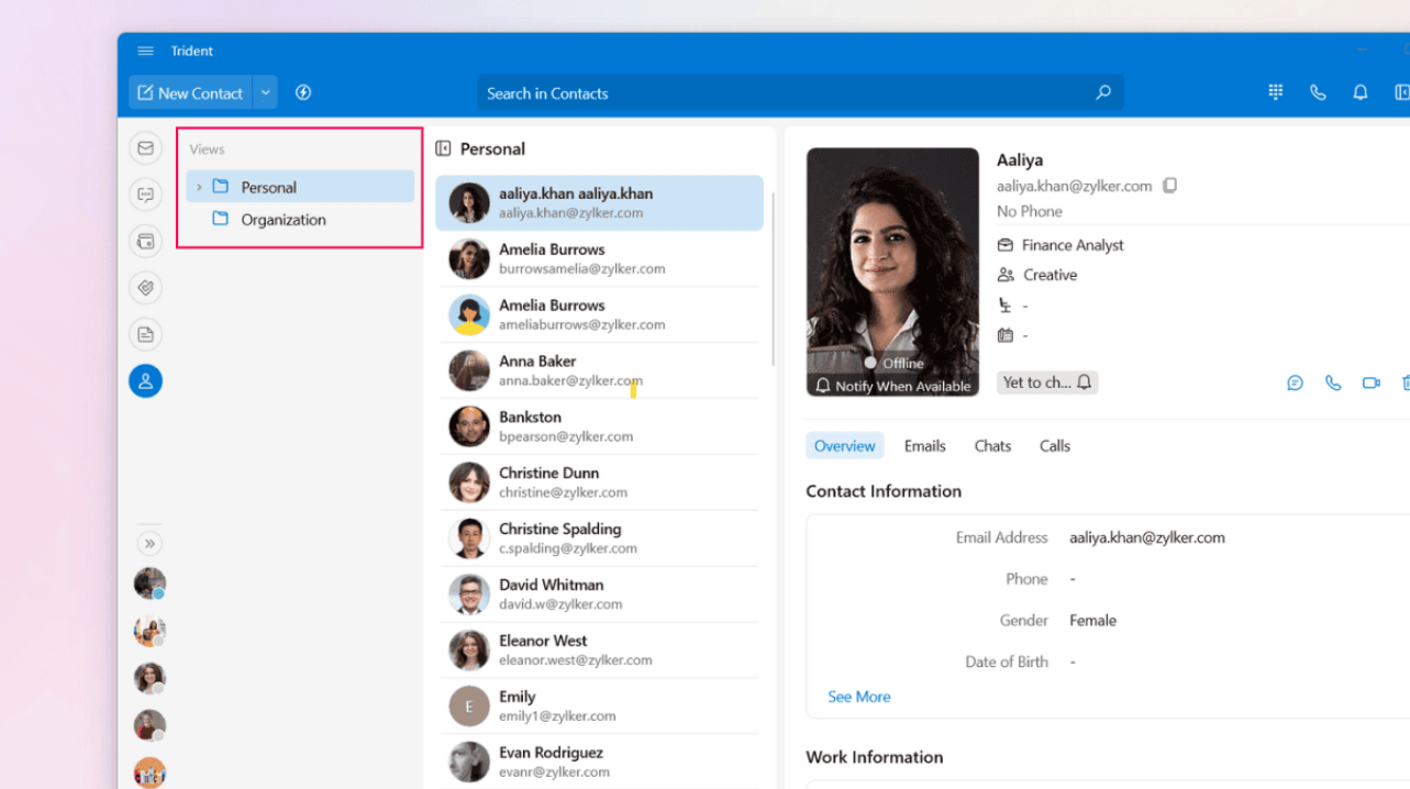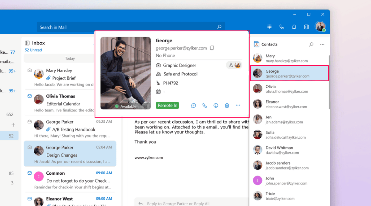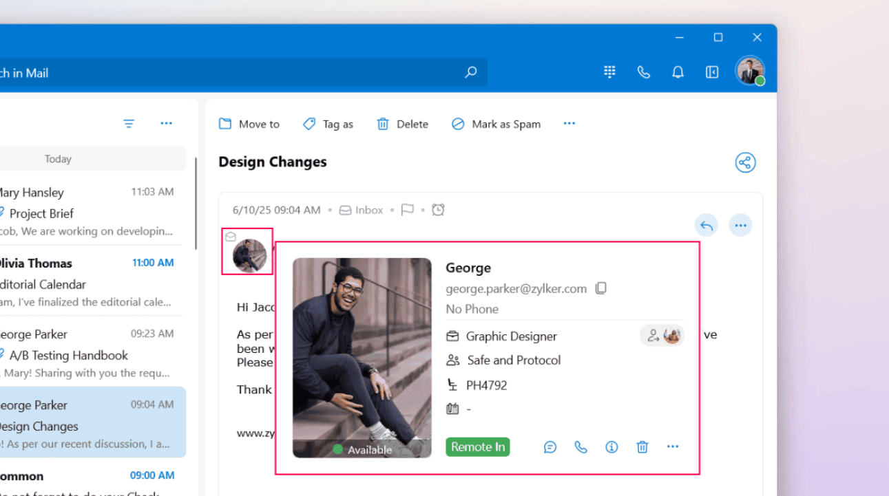 You can access the contact card from multiple places across the app, the Mail Detail View, Cliq chat bar, and the Contacts widget.