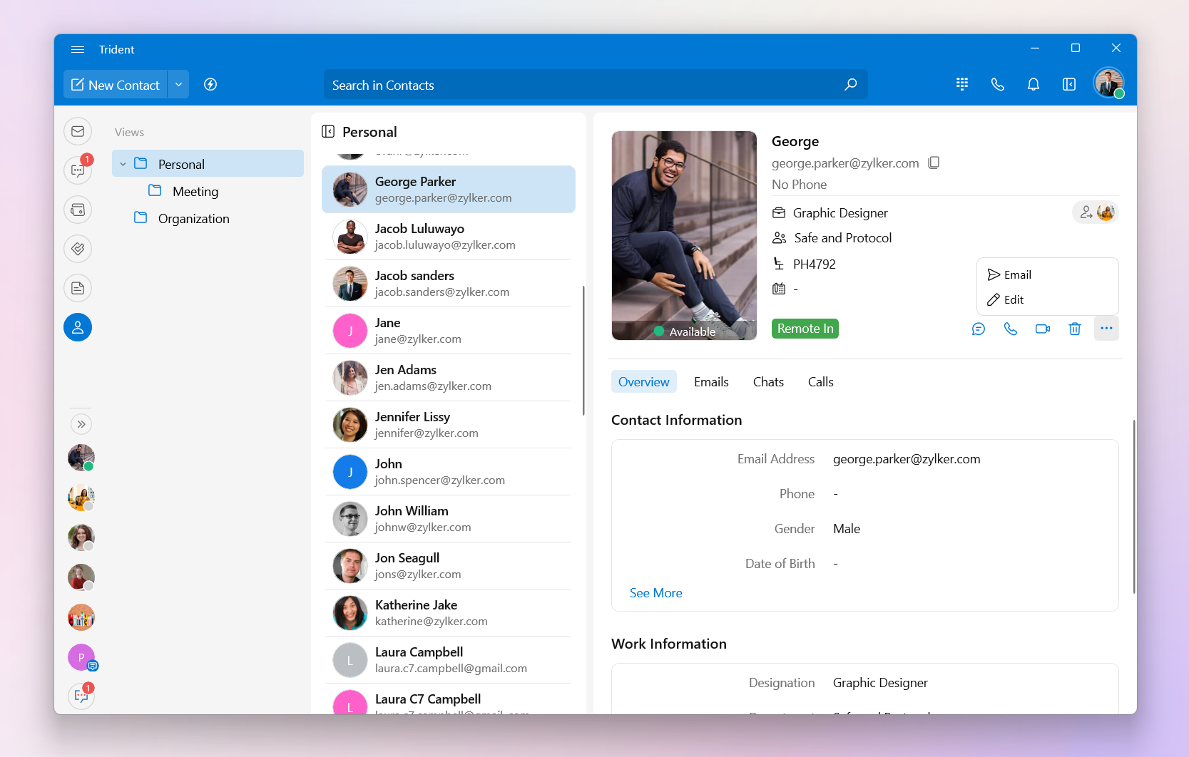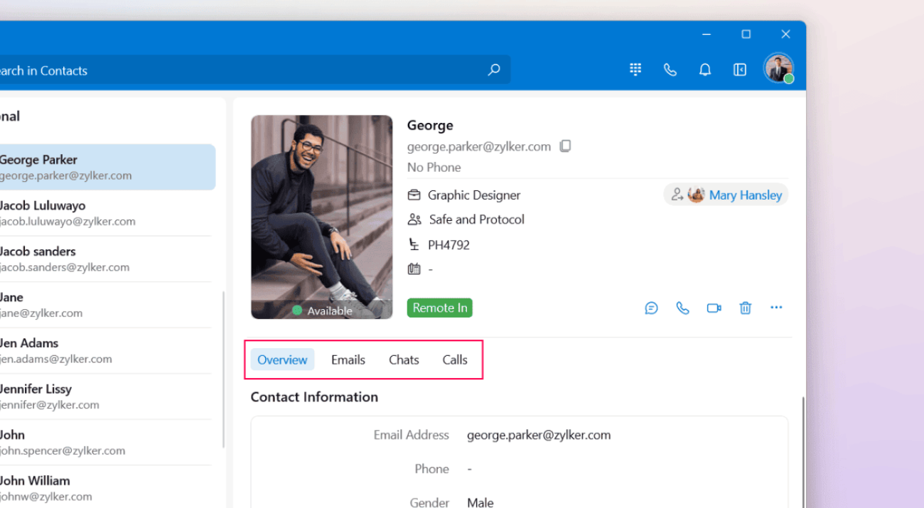 In addition to the contact card, you can access contact details, organized into three tabs: Overview, Emails, and Chats, each offering specific information.