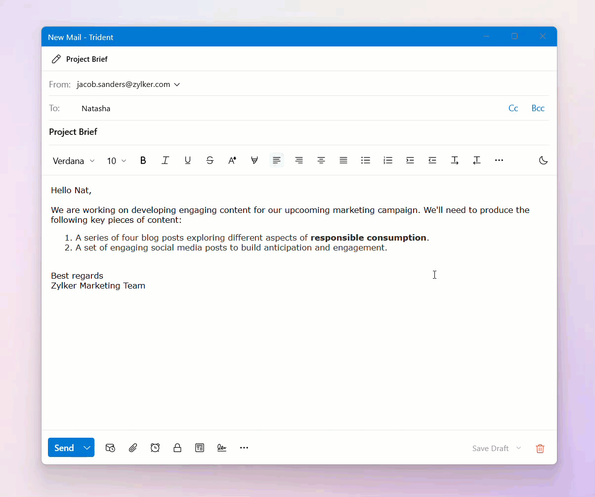 Note: You can also copy-paste images to the Mail Composer.You can have multiple email signatures and customize them according to your email address or email alias used from the Mail web app. In Trident, the default signature will appear in the editor whenever the Mail Composer is invoked. To switch between other signatures:
