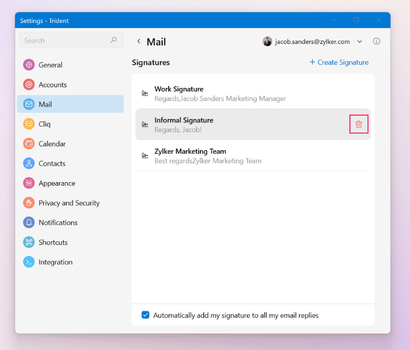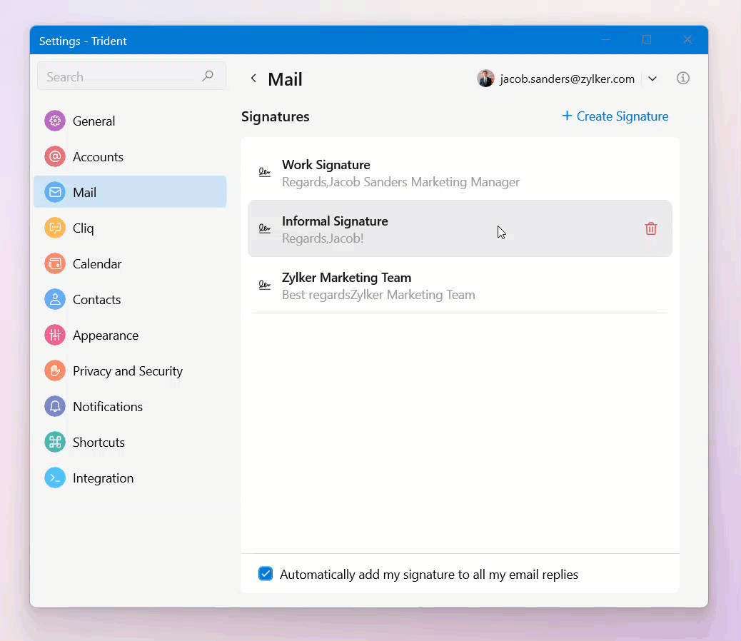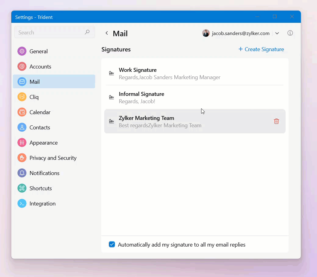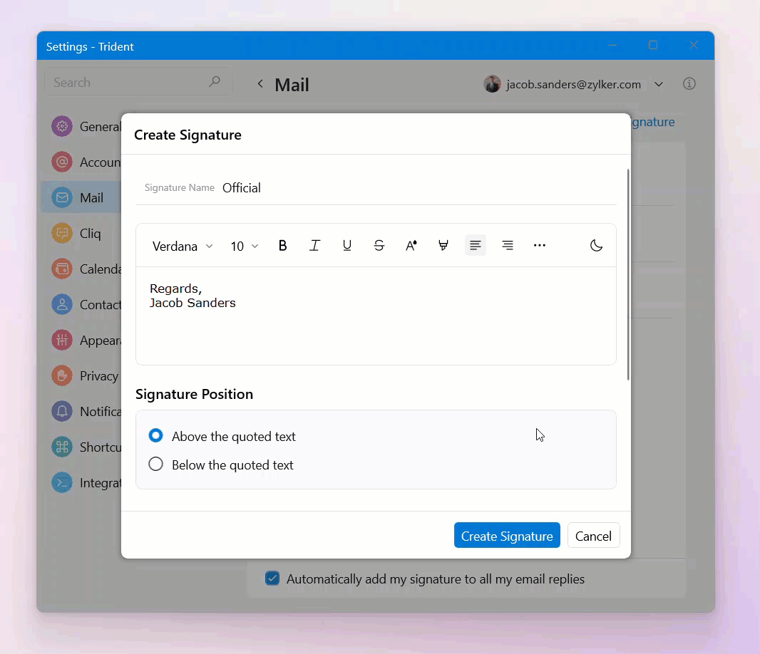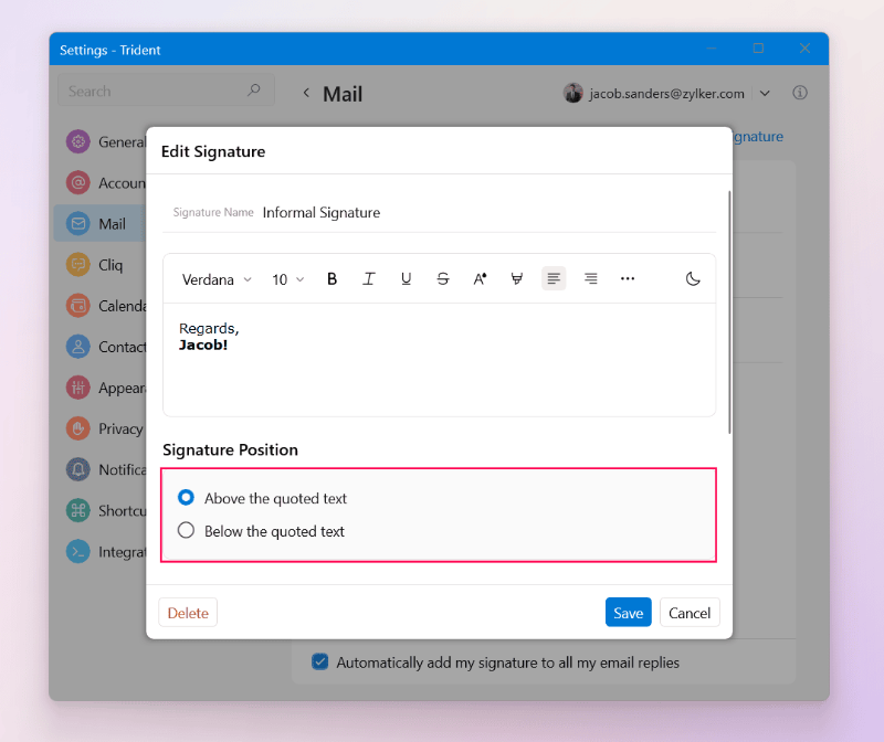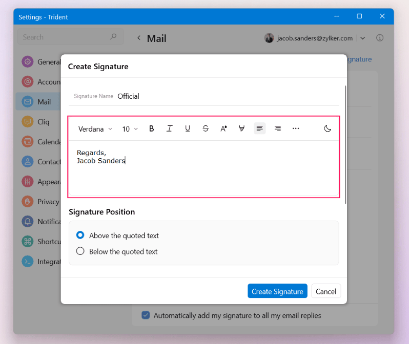 While replying to emails or forwarding them, you can position your signature above or below the quoted text.
