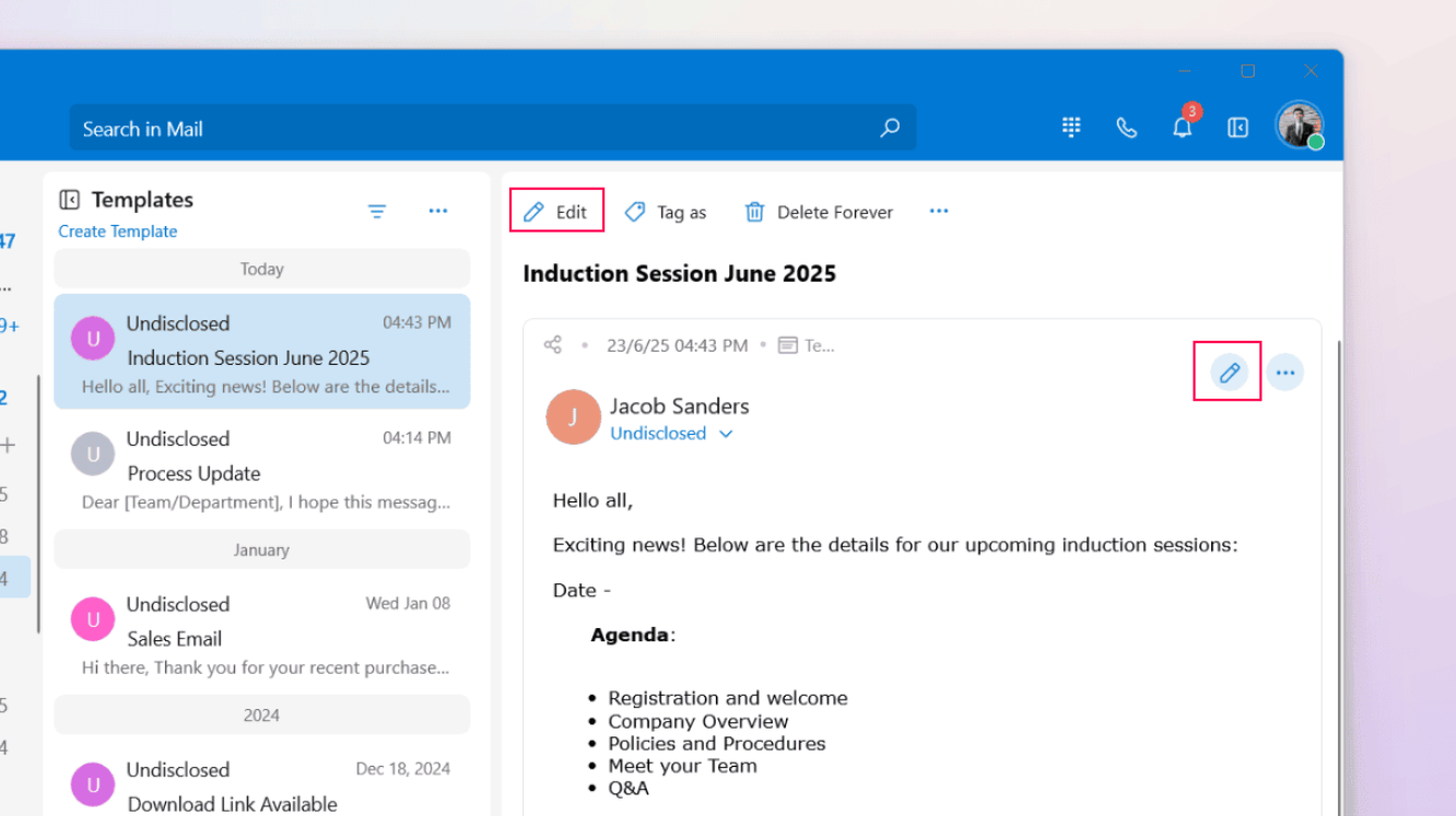 To edit a template from the detail view, select Edit from the toolbar or click the edit icon at the top-right corner of the template.