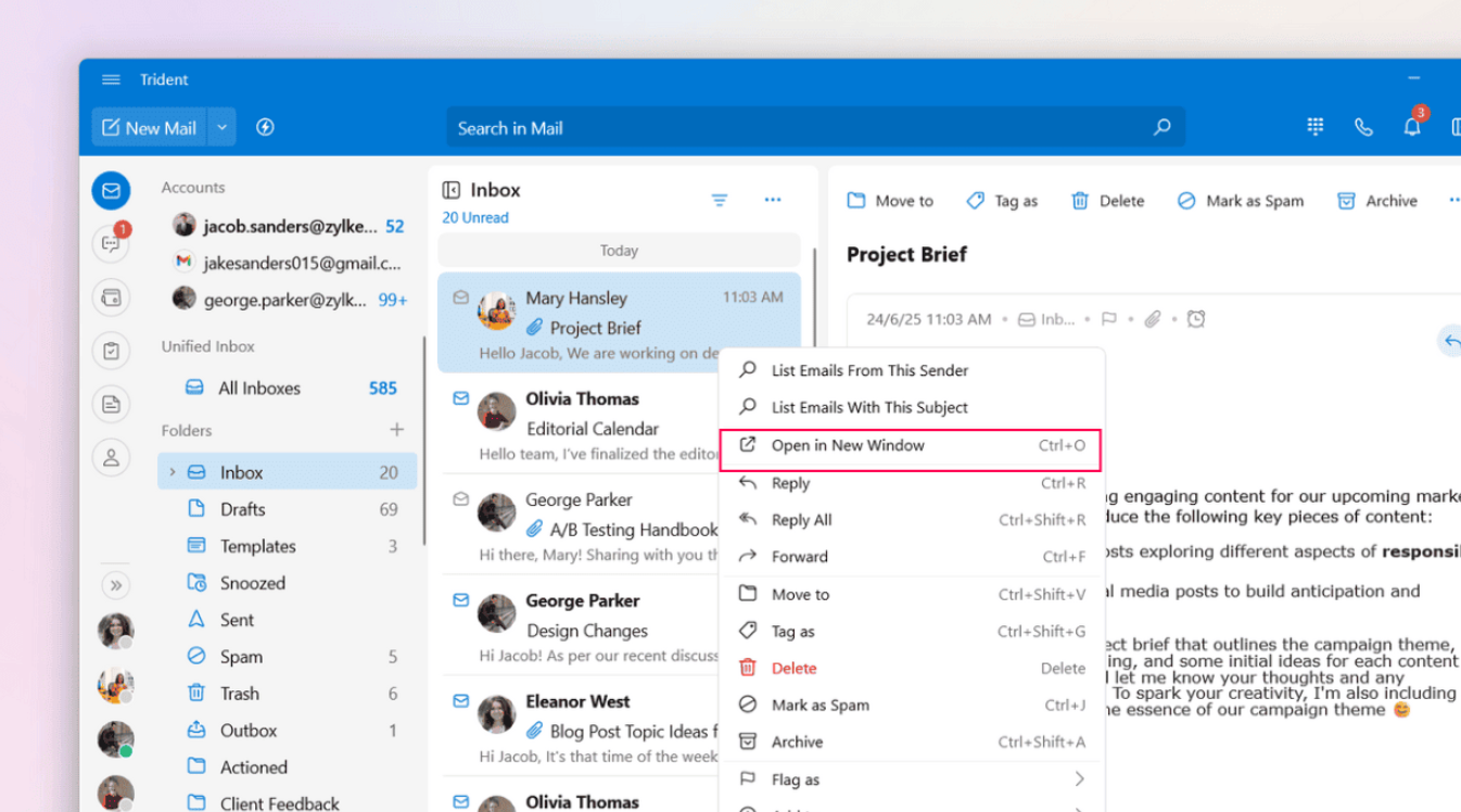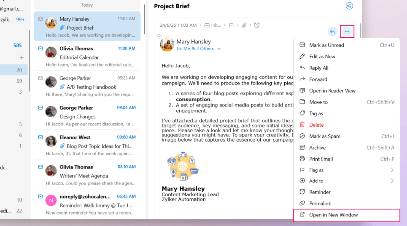 To view your emails in a new window, double-click the email or: