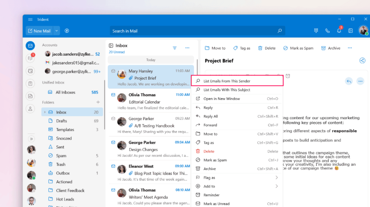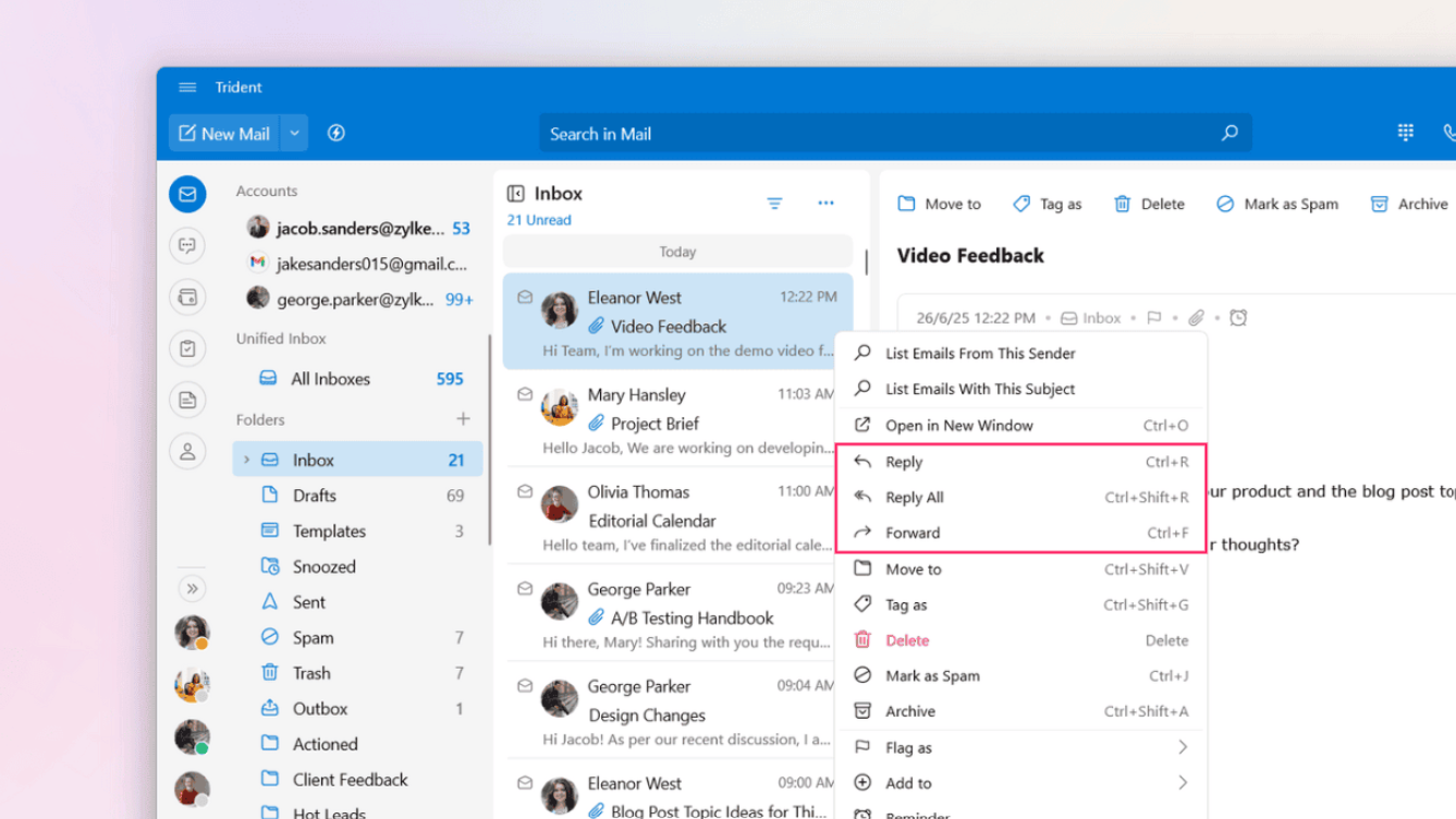 The menu list that appears on right-clicking the email, |