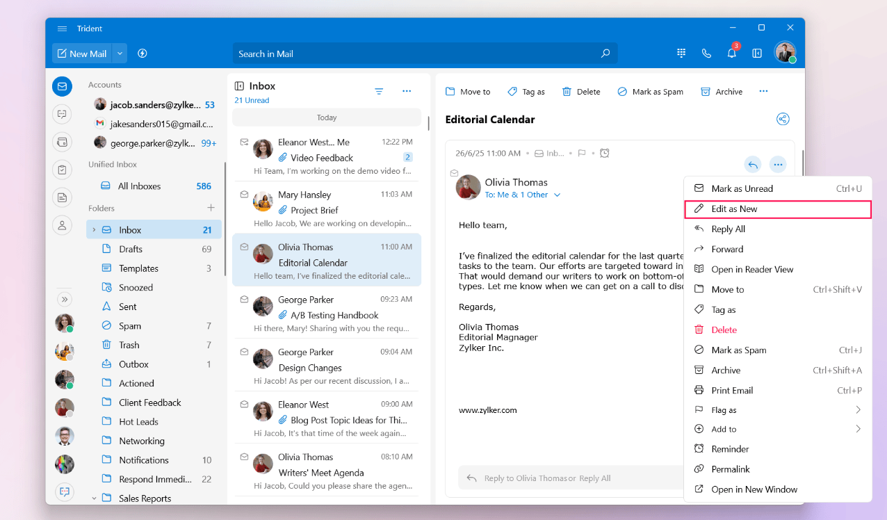 You can make changes to an email you've received or that has already been sent, by using the Edit as New option. Clicking on this option will open the email in the Mail Composer window, allowing you to make necessary changes to the email content.
