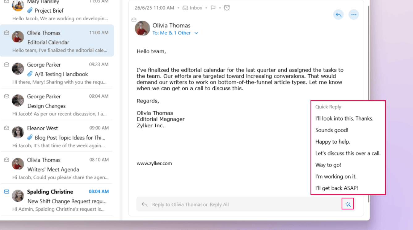 You can choose from a variety of pre-written email responses to respond to emails quickly. To do so: