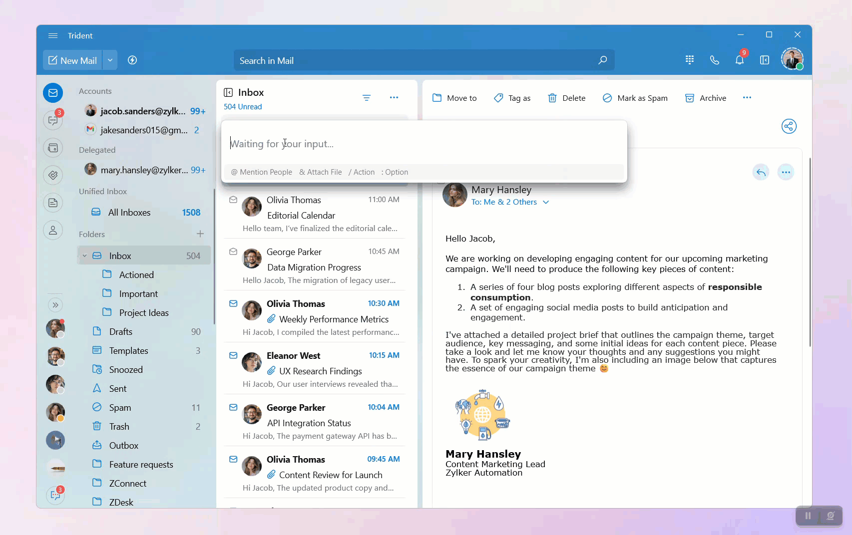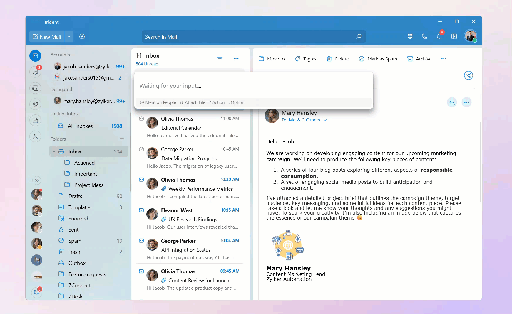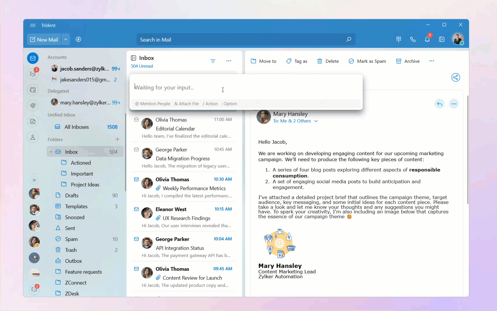 You can upload attachments and add emojis to any content (email, chat, tasks, and notes) you're creating.